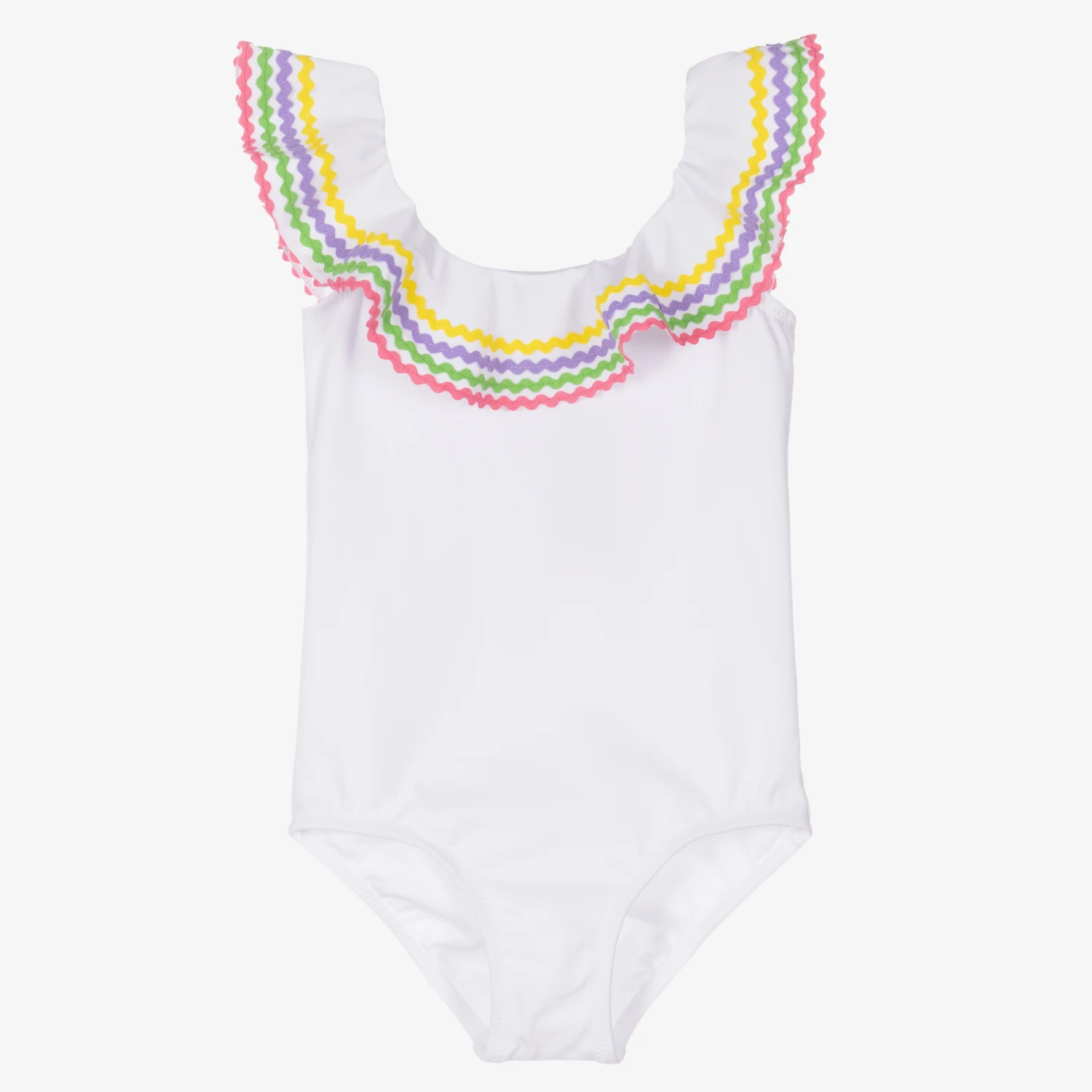 White swimsuit for girls by Nessi Byrd, with UV50 sun protection. Silky smooth and fully lined, it has a lovely ruffle around the top with colourful ric rac trim.