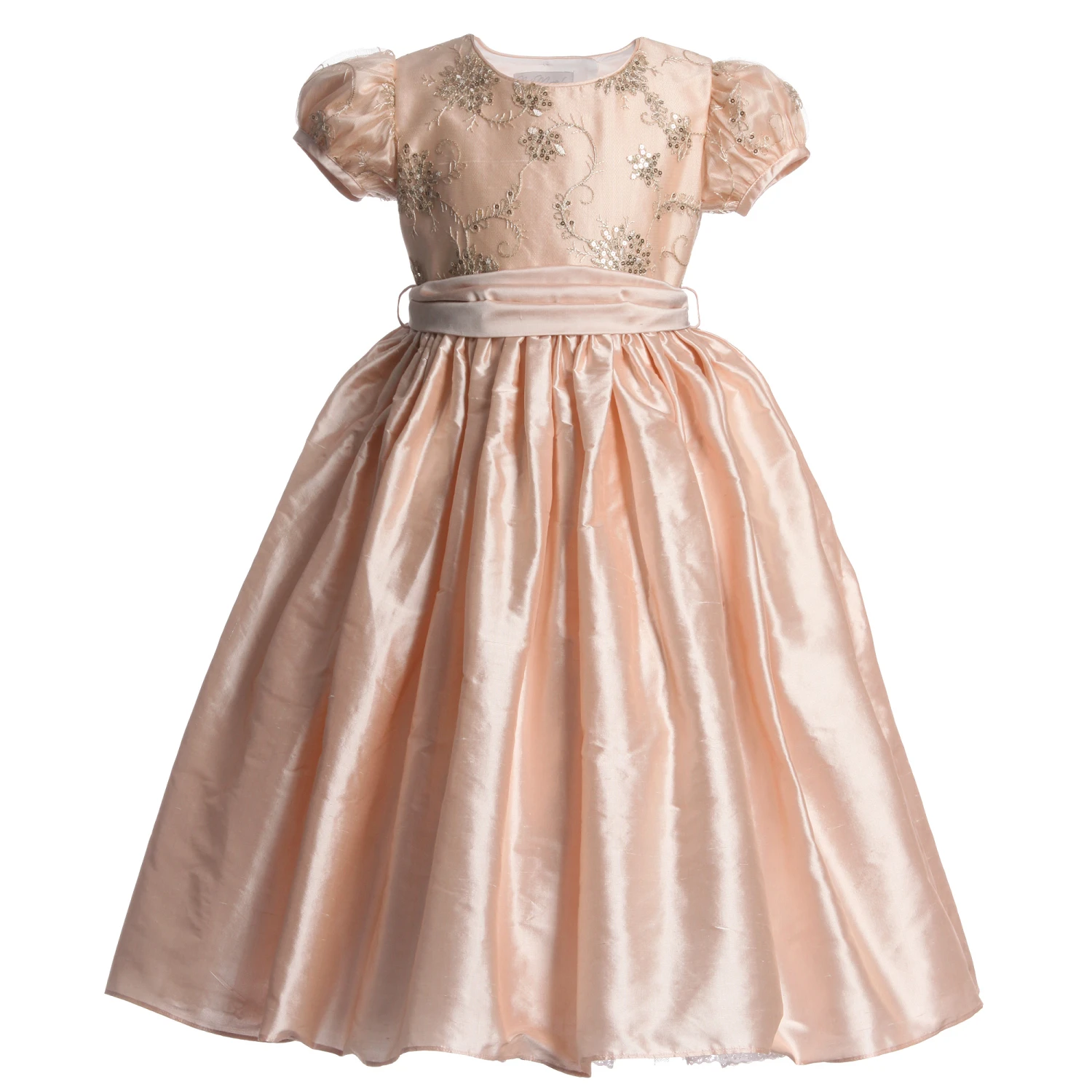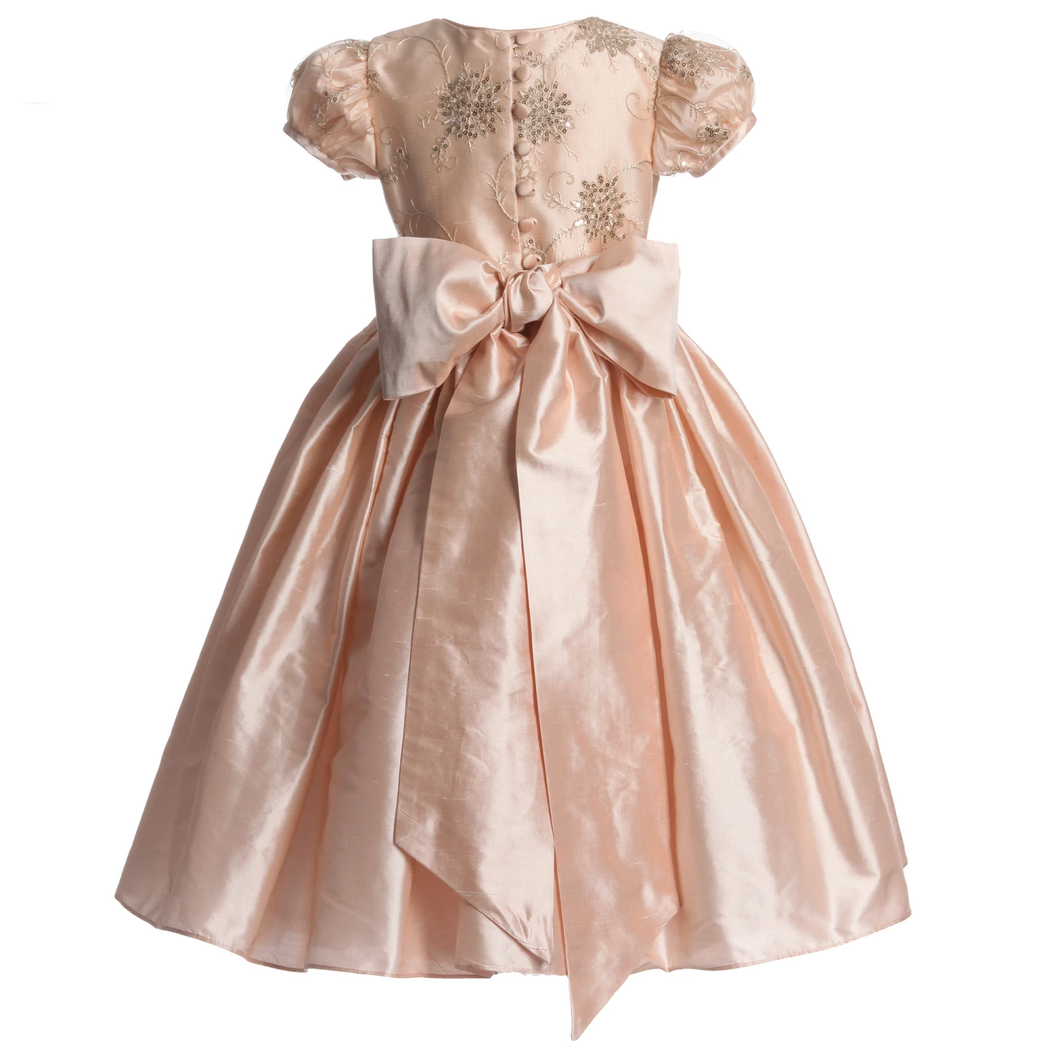 Made in pretty pink silk, this dress by Nicki Macfarlane, has a tulle overlay on the bodice, with gold sequins and embroidery. It has stiff tulle underskirts and a silky lining that gives the dress a full shape, with puff sleeves and a large silk sash that ties around the waist. There are silk covered buttons that fasten down the back.