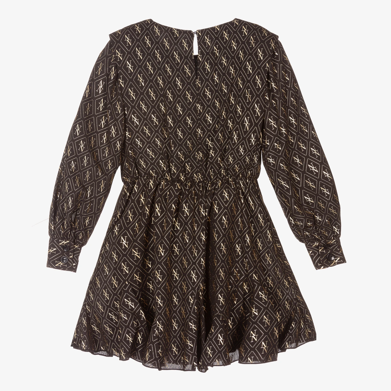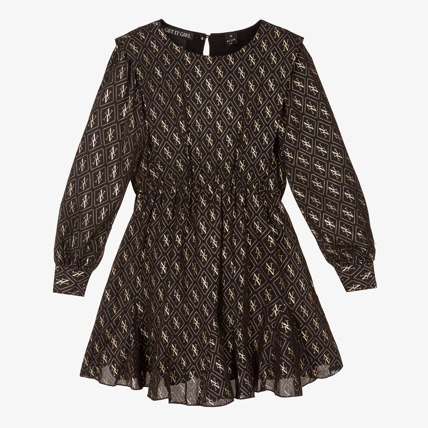 Girls black chiffon dress from NIK&NIK, with a shiny gold logo pattern. This beautiful flared dress is lined in super-soft viscose and has an elasticated waistband for comfort. It fastens with a single button on the back and has a logo tab on the hem.
