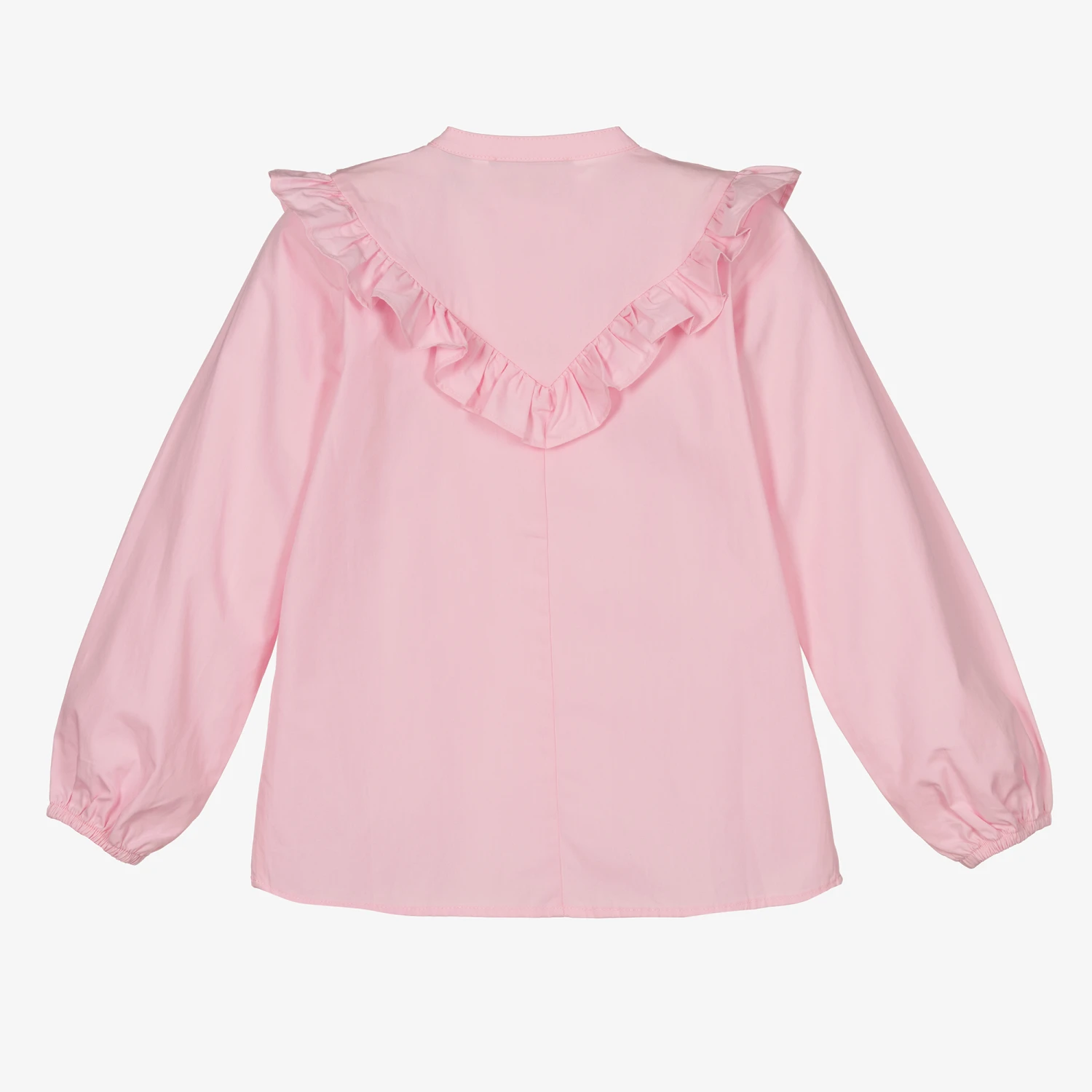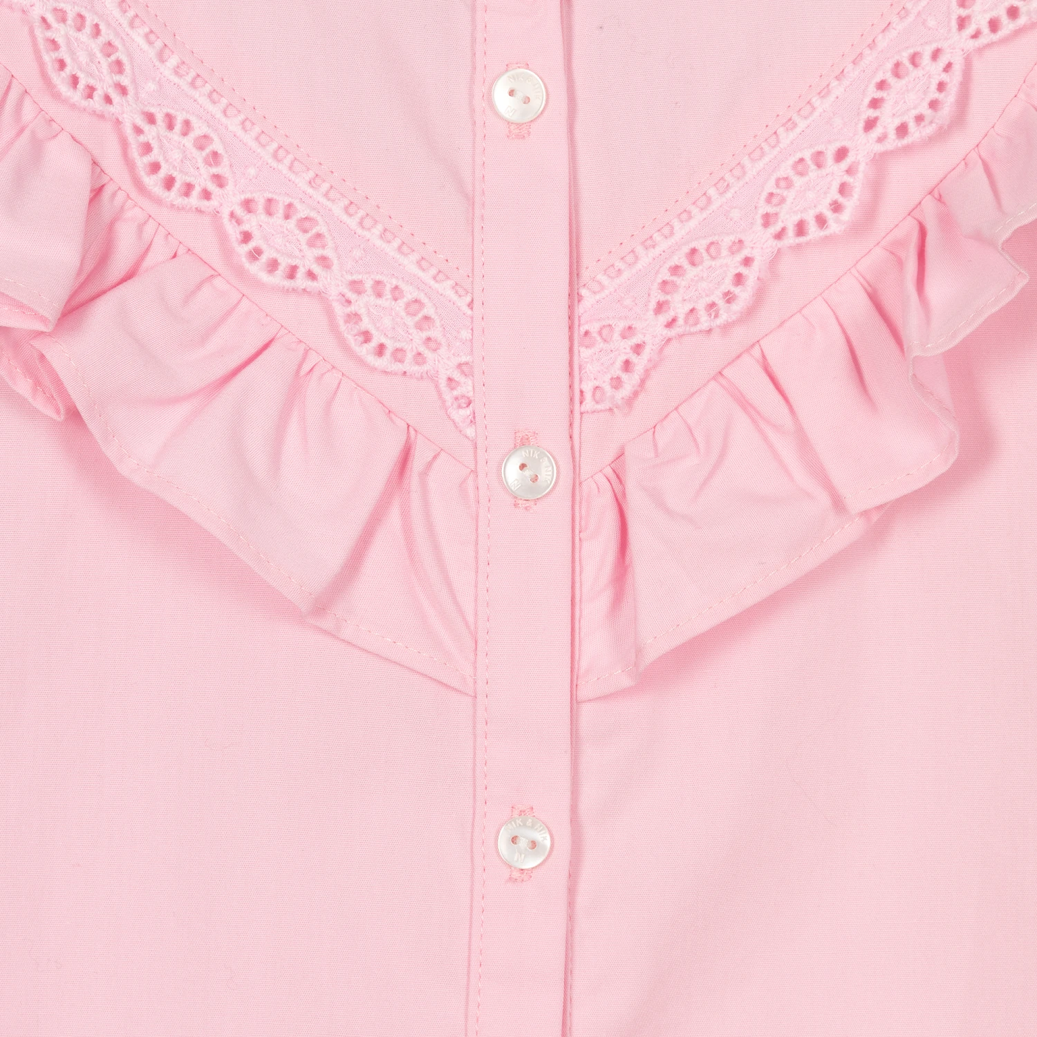 Girls pink collarless cotton blouse for girls by NIK&NIK. Made from soft, mid-weight cotton it has long sleeves and pretty plain and broderie anglaise