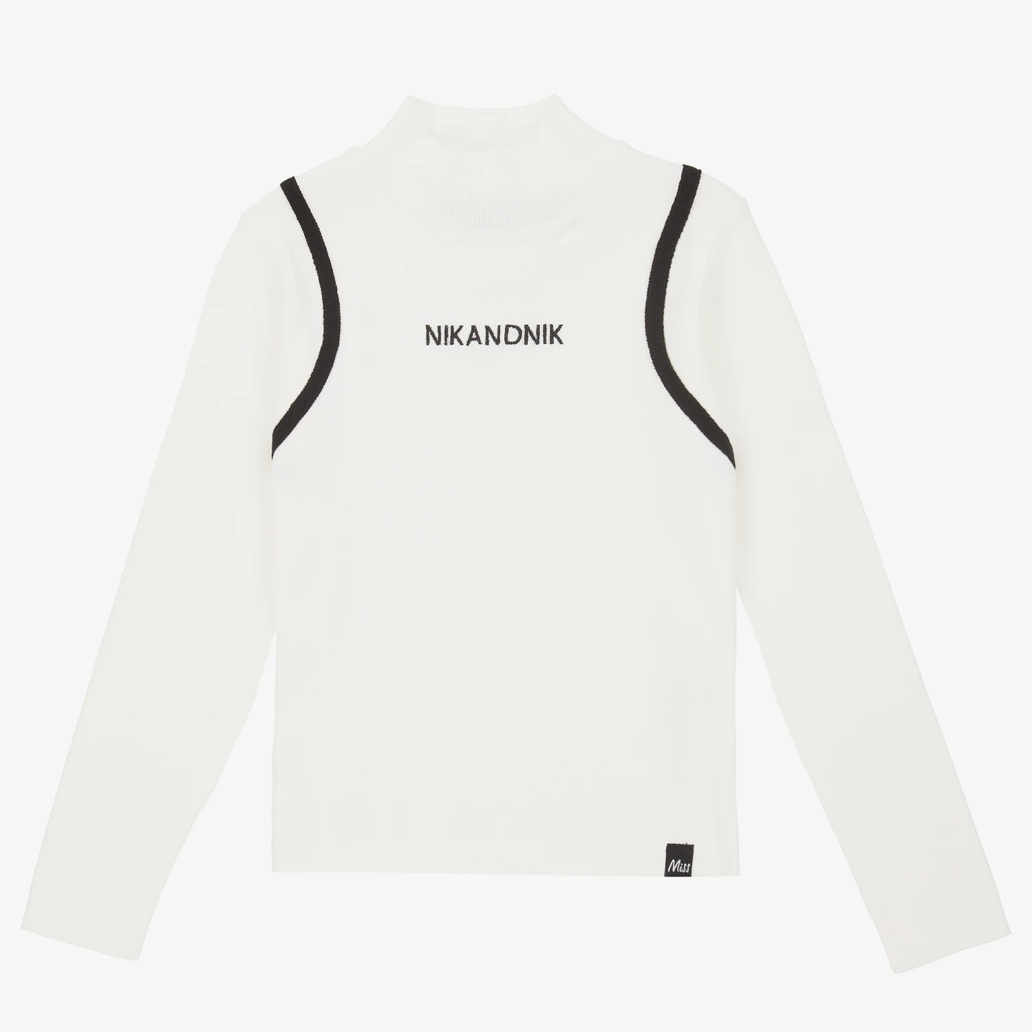 Girls off-white turtleneck top from NIK&NIK, knitted in soft and lightweight viscose. It has black trim and an embroidered black logo on the chest.