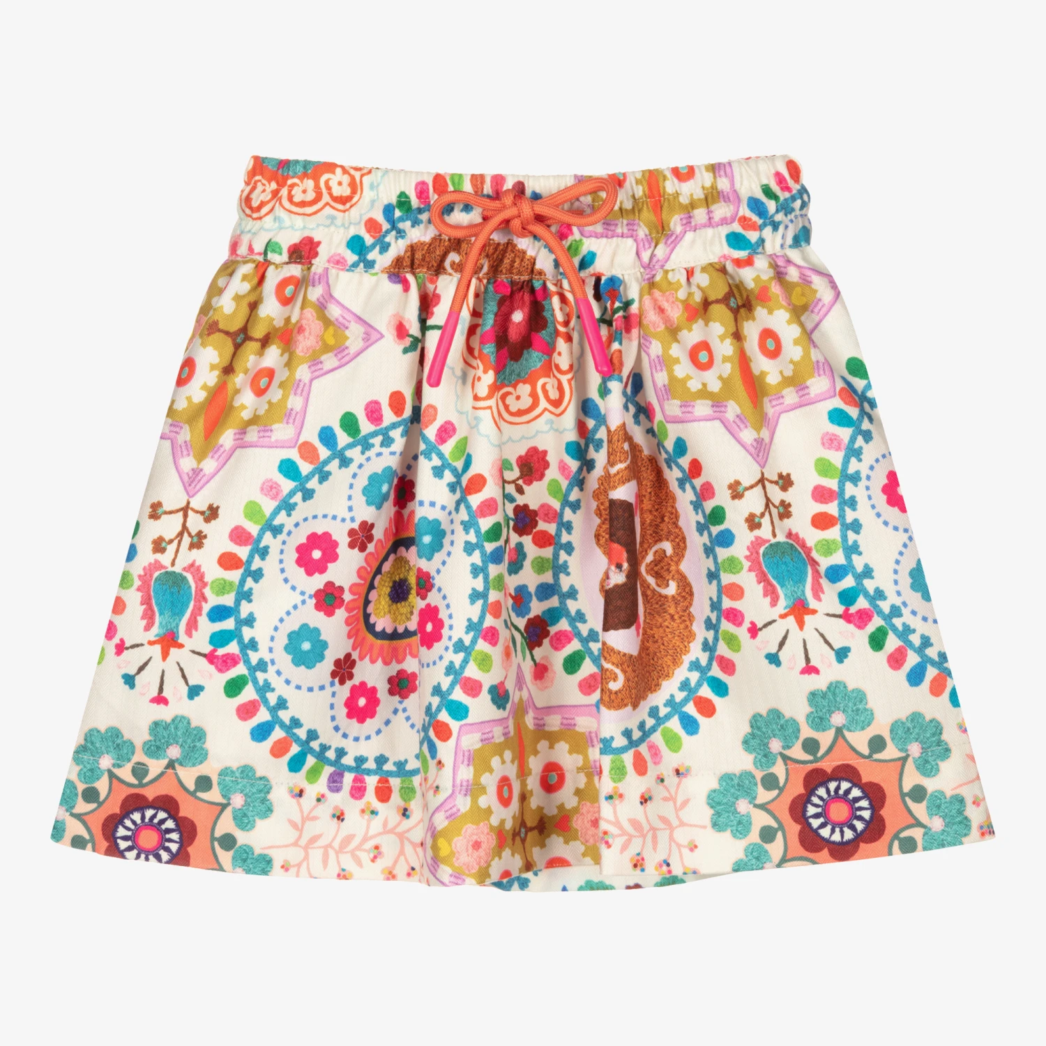 Lovely ivory skirt for girls by Oilily, with a colourful floral print. Made in super soft, lightweight polyester, it has an elasticated, drawstring waistband with the brand’s logo badge on the back, and concealed side pockets.