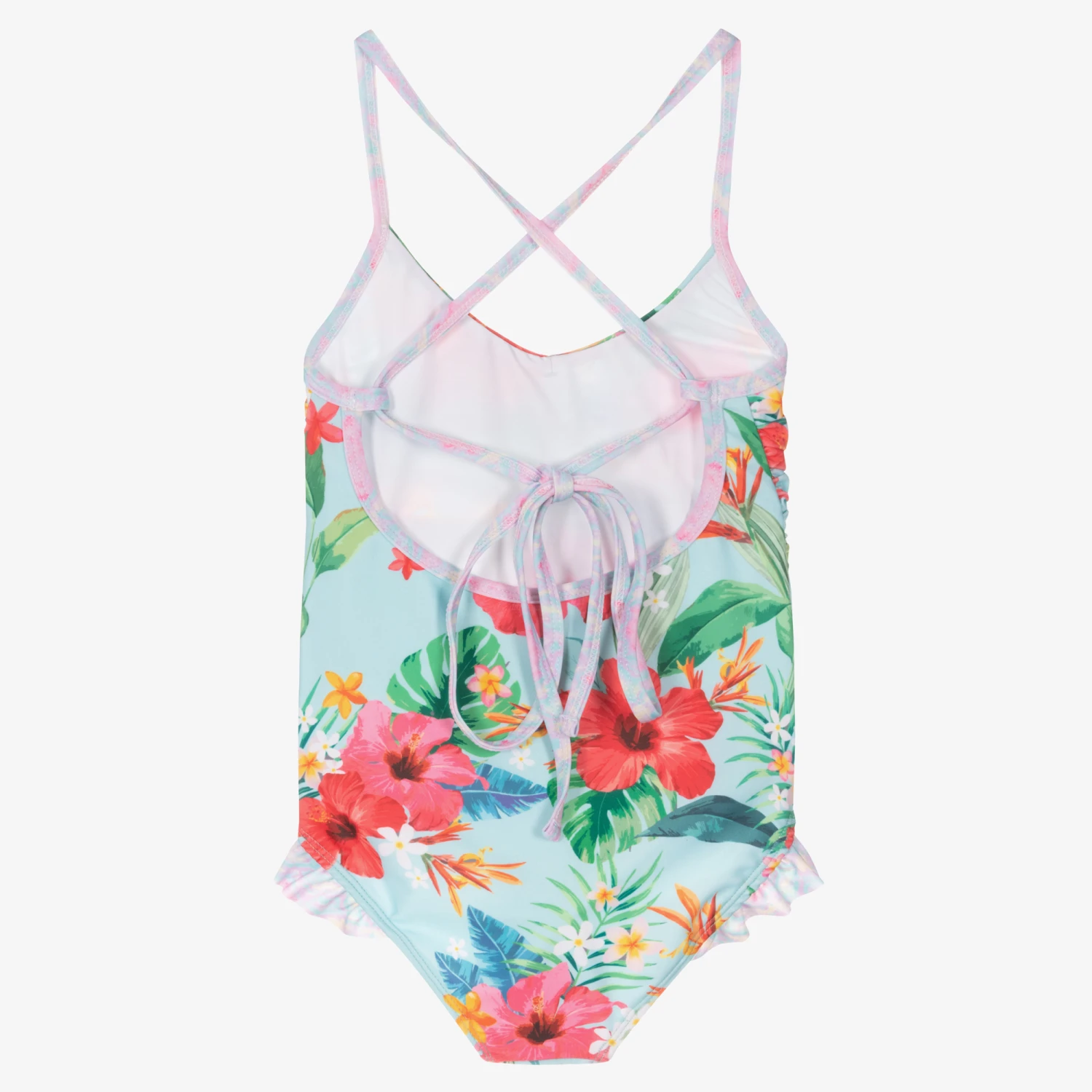 Aqua blue swimsuit for girls by Australian swimwear brand Olga Valentine, made in silky soft and stretchy fabric with a UPF 50+. In a tropical pink floral print, this fun one piece is fully lined for comfort and features ruching on the front. The ruffle trims on the leg are designed in a contrast pink and lilac purple marble print. The slim shoulder straps crossover and tie on the back for a fully adjustable fit. This item is made with recycled Repreve fabric.
