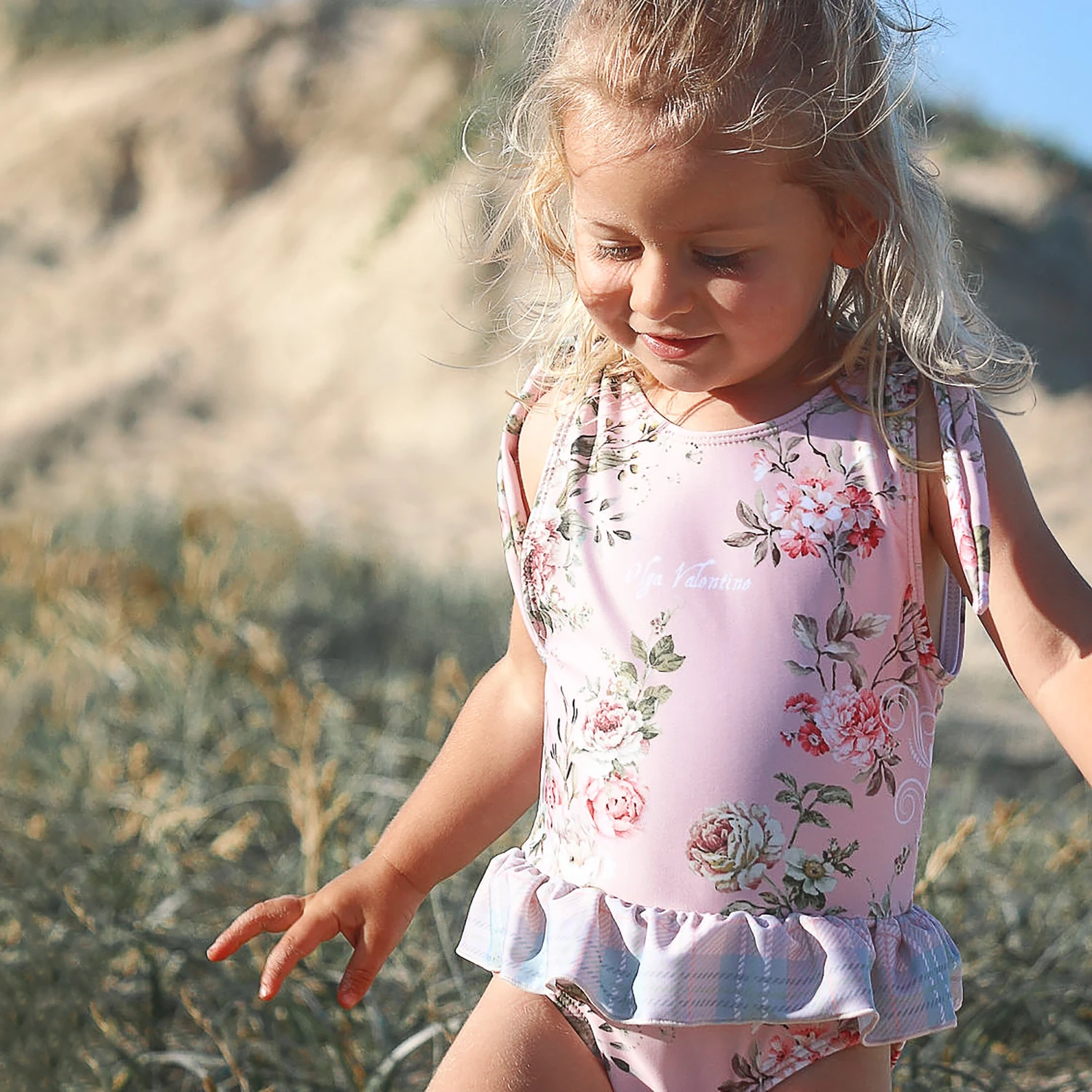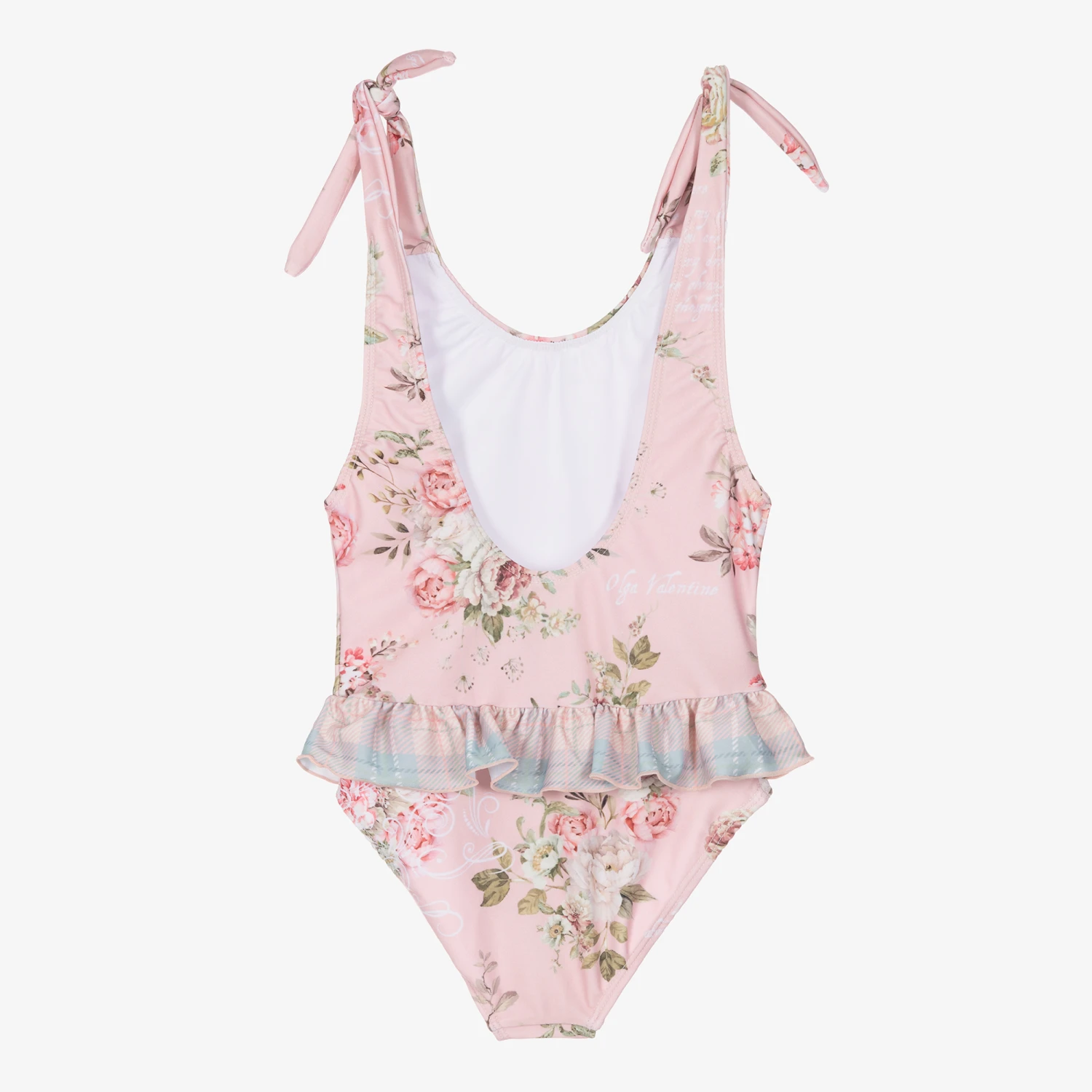 Charming pink swimsuit for girls from Olga Valentine, made in silky smooth recycled fabric with UPF50+ for added sun protection. Patterned with a feminine floral print all over and with a ruffle detail around the waist, it creates a pretty silhouette. It is fully lined for added comfort and the straps can be tied for a personalised fit.