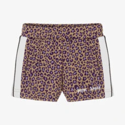 Beige shorts for girls by luxury Italian brand Palm Angels, knitted in the softest jersey. Eclectically styled, these cool shorts feature a purple leopard pattern for an eye-catching streetwear look. The brand’s signature Palm Angels logo is printed on the front, with bold white taping down the sides. They are comfortably finished with an elasticated waistband and concealed side seam pockets.