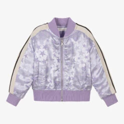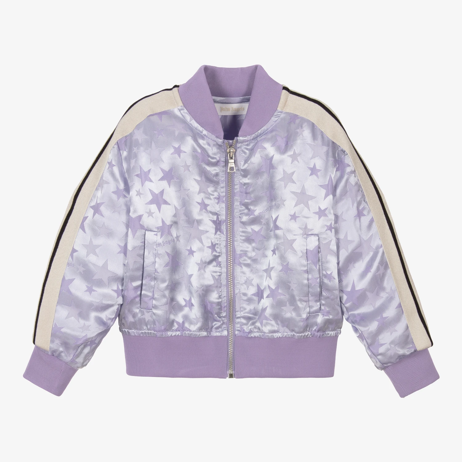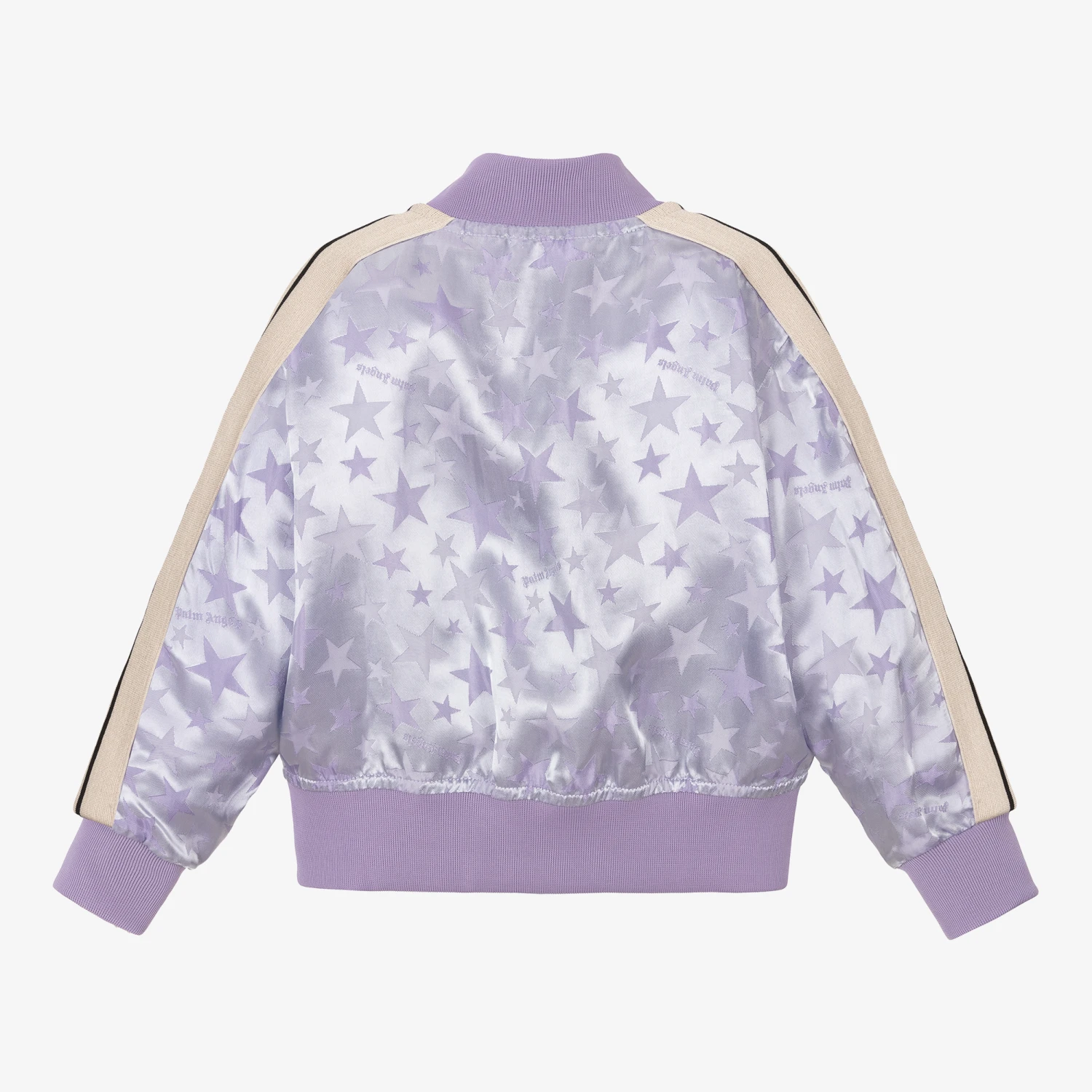 Lilac purple track top for girls by Italian label Palm Angels. It is made in luxuriously silky satin in a lovely star and Palm Angels logo jacquard pattern with soft ribbed trims. The sleeves are trimmed with knitted ivory and black striped trims for contrast and a retro vibe. It fastens with a branded matt silver zip on the front and there are two useful hand pockets.