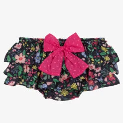 Little girls navy blue ruffle bloomer shorts by Paloma de la O, with a pretty floral print. Made in soft cotton poplin, they have a pink bow on the back and an elasticated waist and leg holes.