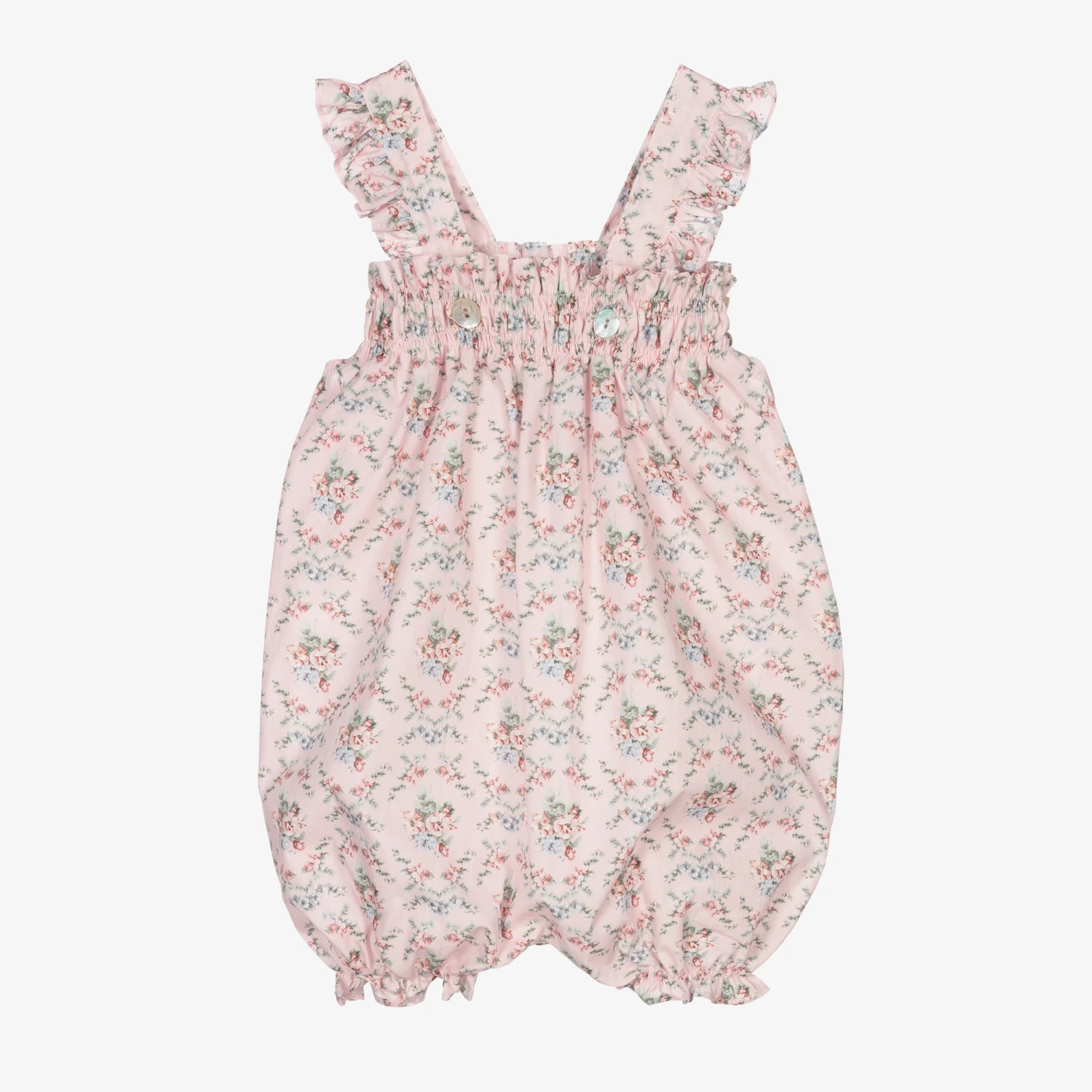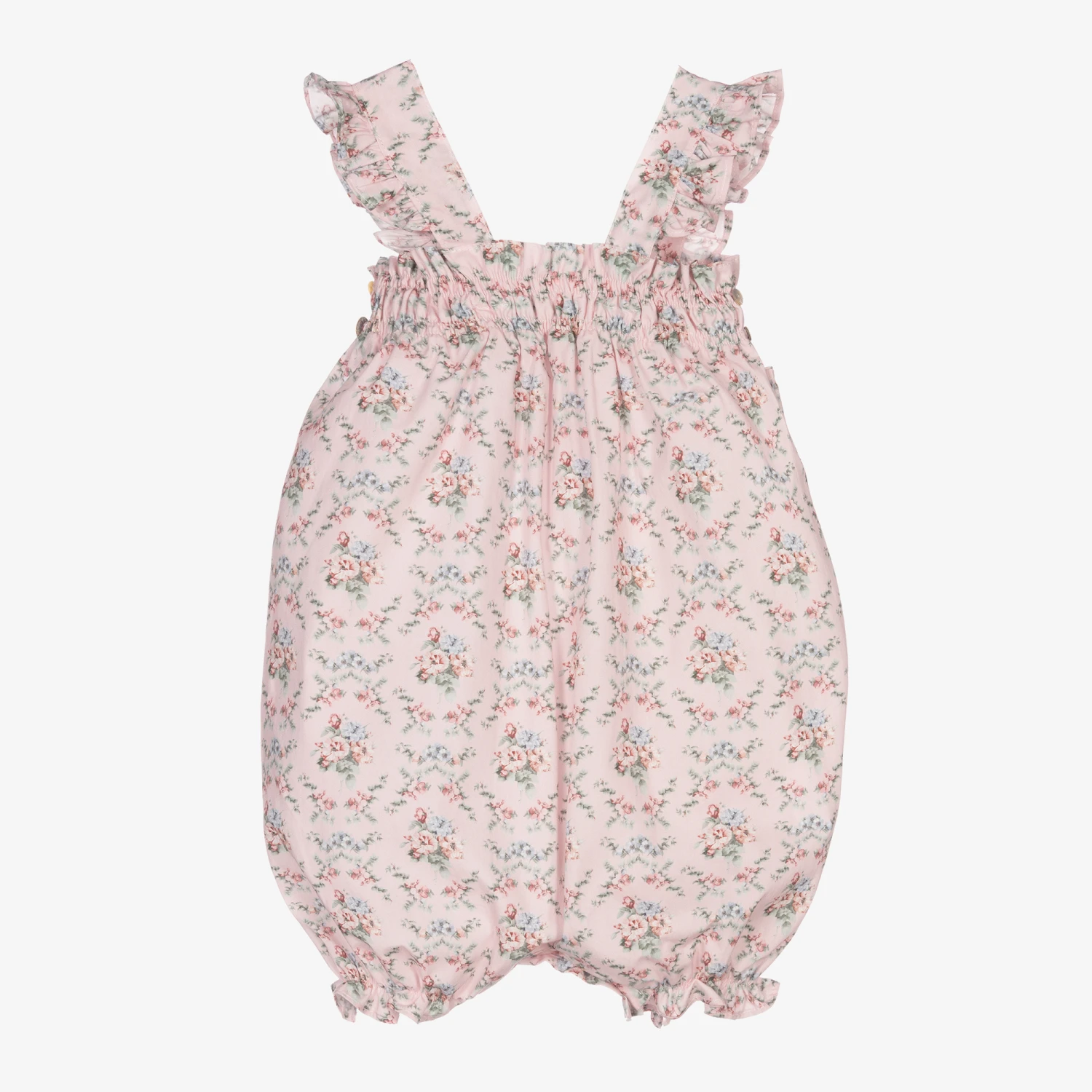 Younger girls pink floral dungaree shorts by Paloma de la O. Made in soft cotton poplin, they have a pink background and a pretty blue and pink floral print. They are ruched at the top and have buttons at the sides and between the legs for easy dressing and changes.