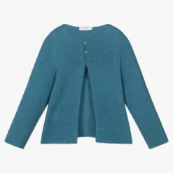 Lovely teal blue cardigan for boys and girls by Paloma de la O. Knitted in a soft cotton blend, it has three button fastenings on the front.