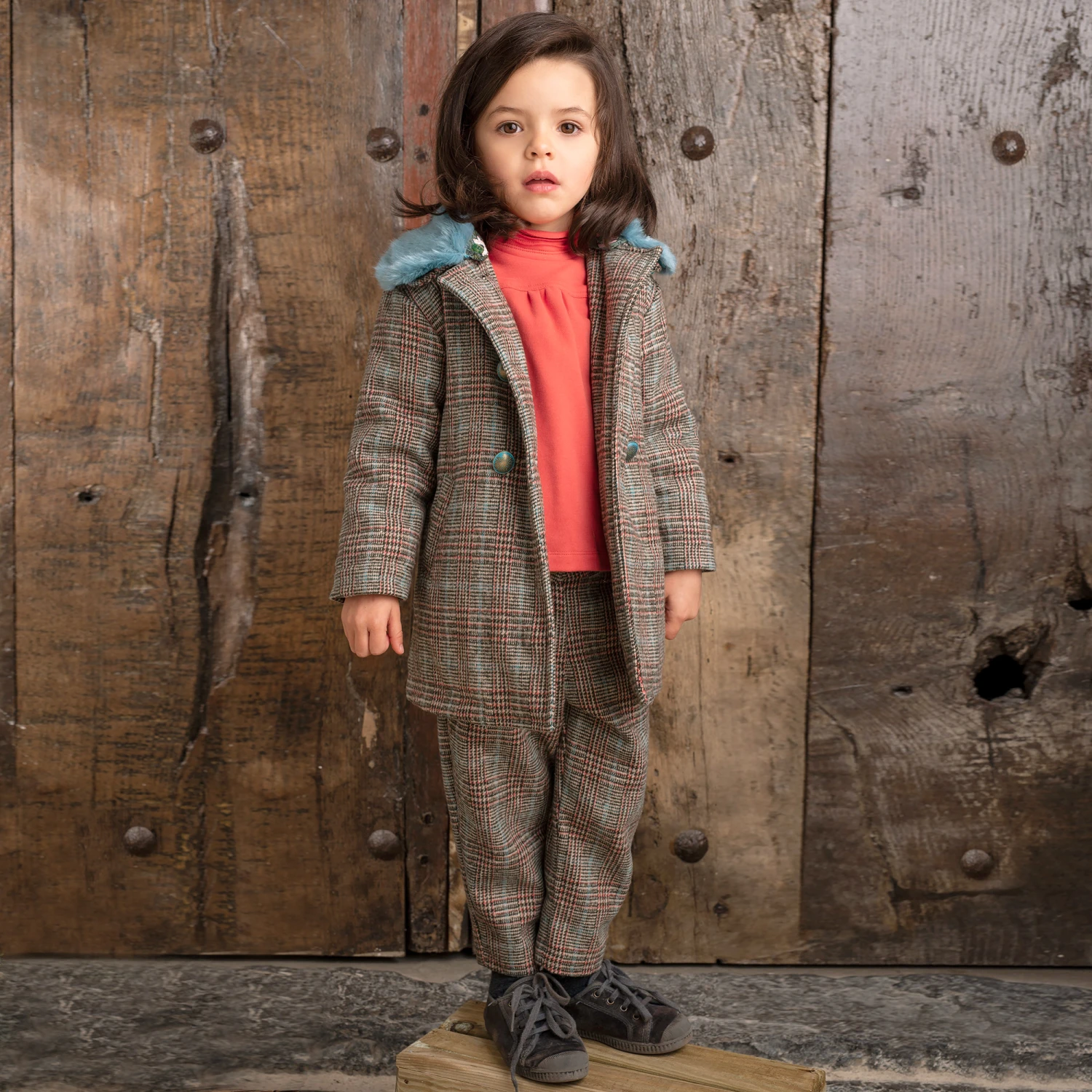 Girls brown and green checked trousers by Pan Con Chocolate, made in mid-weight polyester, with a comfortable cotton lining. They have pockets on the side, and have a zip and button fastening.