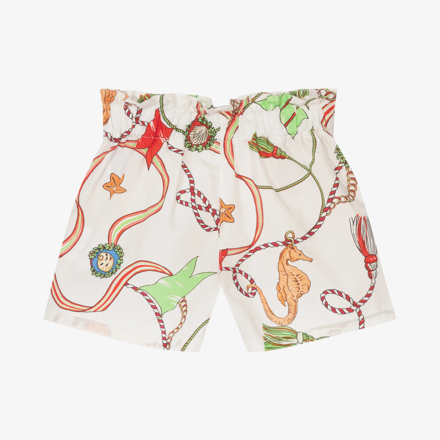 Ivory cotton shorts for girls by Pan Con Chocolate, with a colourful seahorse, rope and chain pattern. Soft and lightweight, they have a large bow at the front and useful pockets. The ruffle-trimmed elasticated waist allows for easy pull on.
