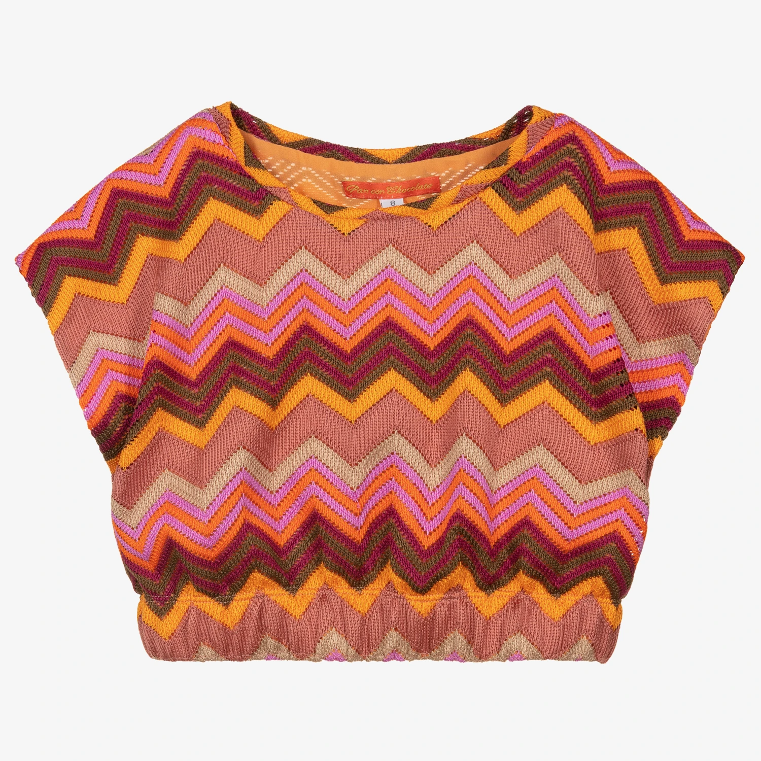 A gorgeous and eye-catching zigzag knit top for girls by Pan Con Chocolate, in shades of orange, pink and brown. Slightly cropped, it has a stylish relaxed fit and an elasticated hem. This easy-to-wear slip-on style, has an orange chiffon lining for modesty and comfort.
