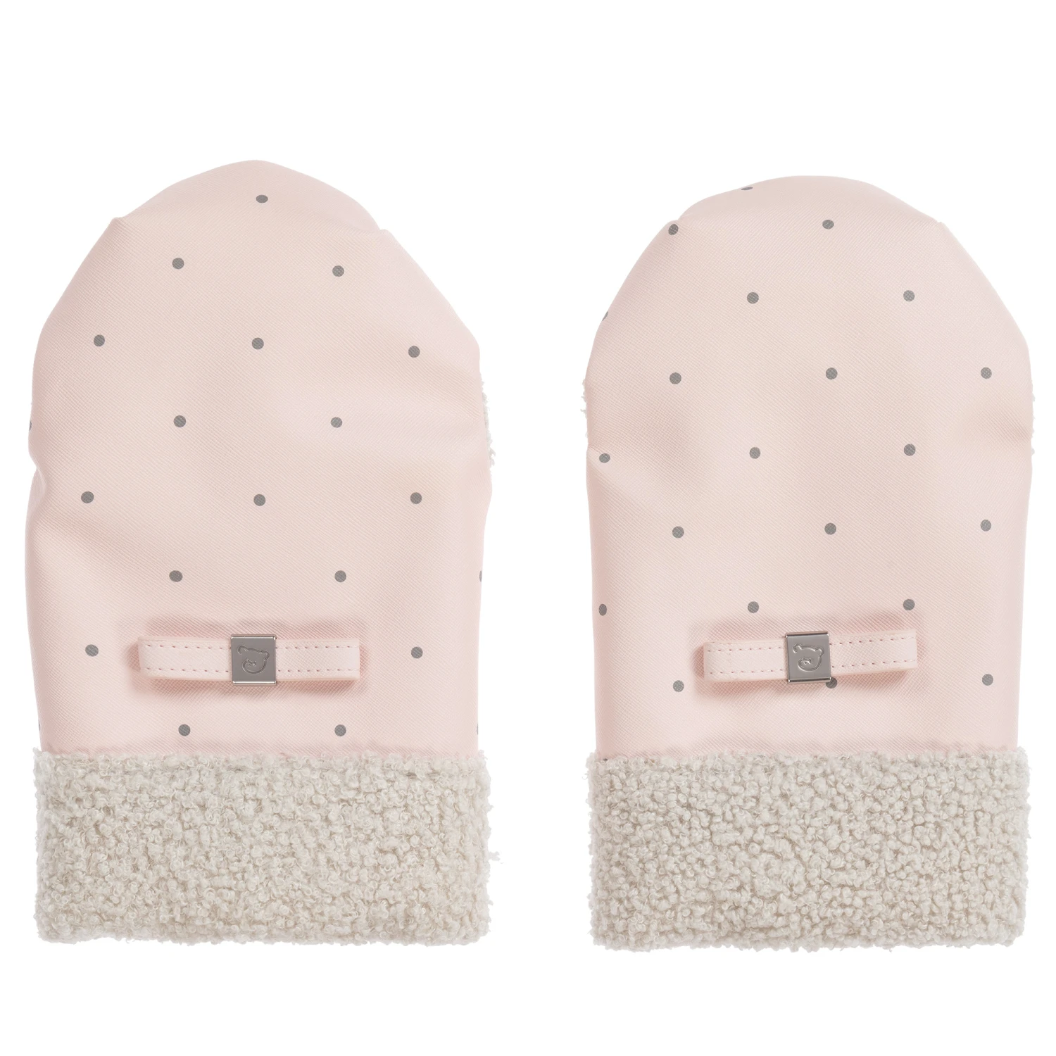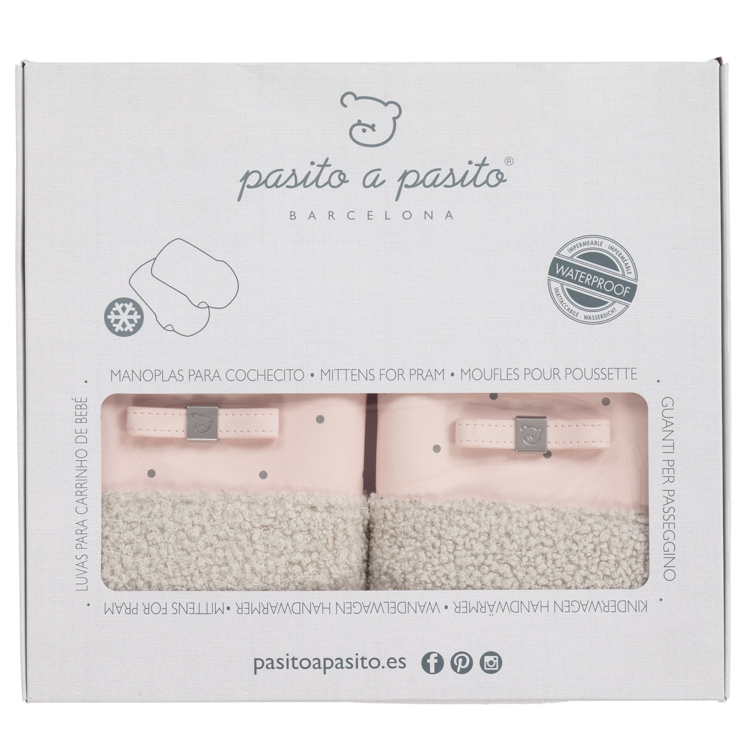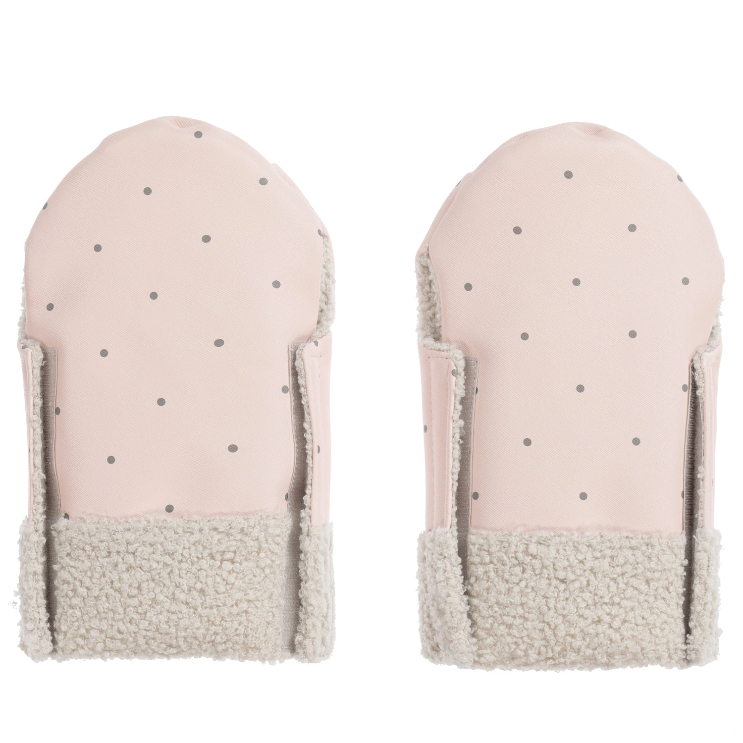 Pink stroller mittens by Pasito a Pasito, ideal for keeping adults’ hands warm whilst baby is in the pram. They are made in pink, waterproof faux leather with grey polka dots and have a soft, grey bouclé trim and lining. They have openings at the sides with velcro fastening, and easily attach to most brands of strollers and prams.