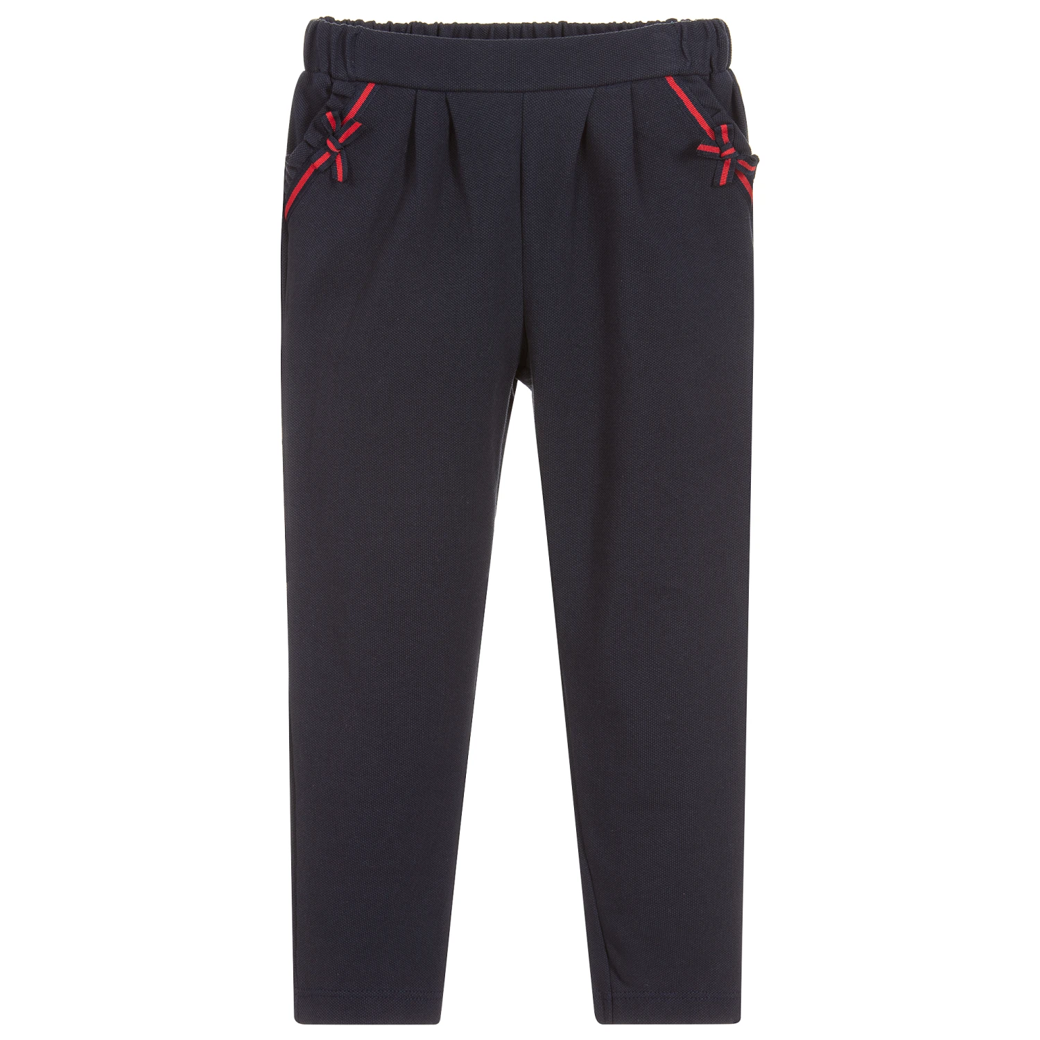 Girls navy blue, cotton piqué trousers, by Patachou. Lightweight and soft, they have an elasticated waistband and red and navy blue grosgrain ribbon trim on the pockets.
