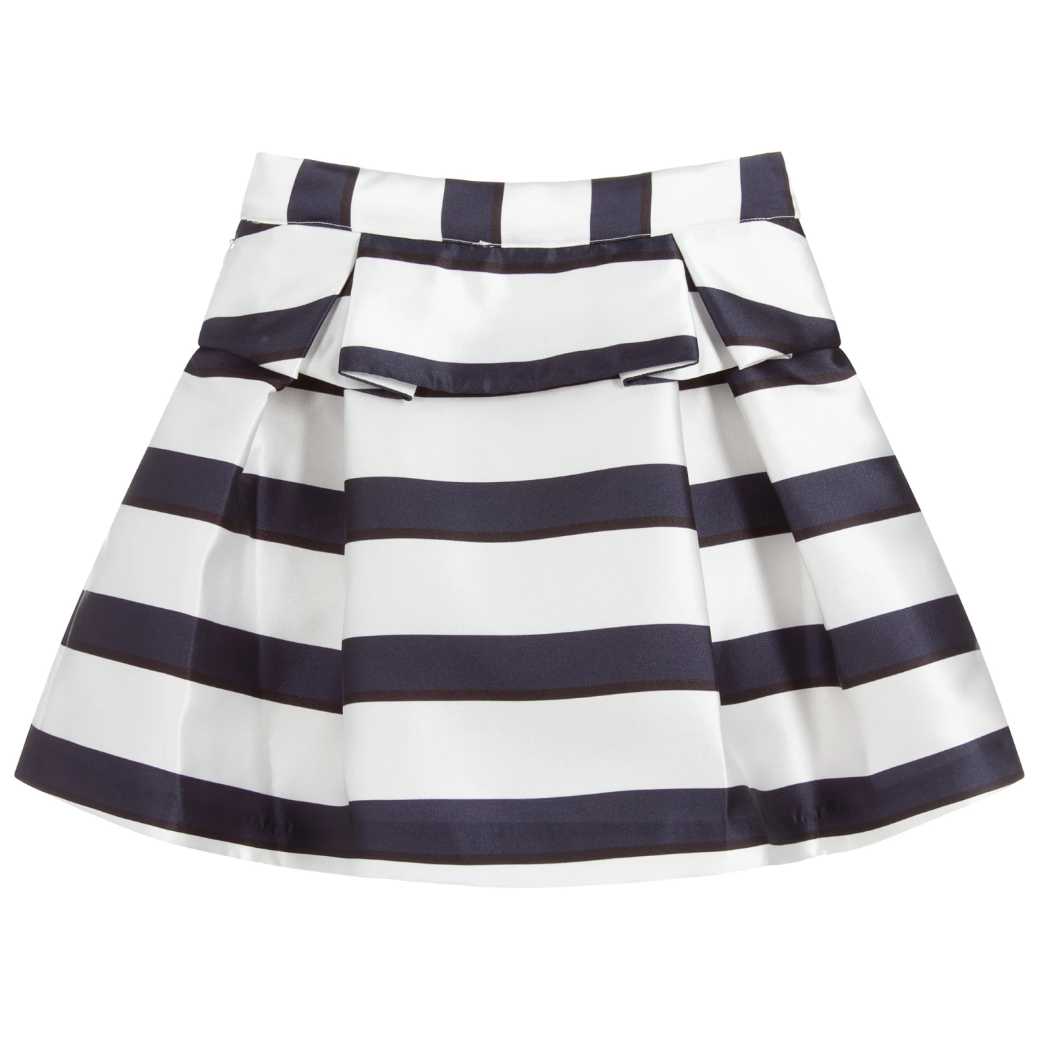 Girls smart blue and white stripe skirt from Patachou, made in lightweight satin. The pleated skirt has a short pleated layer around the waist and a lightweight cotton lining with tulle trim for extra volume.