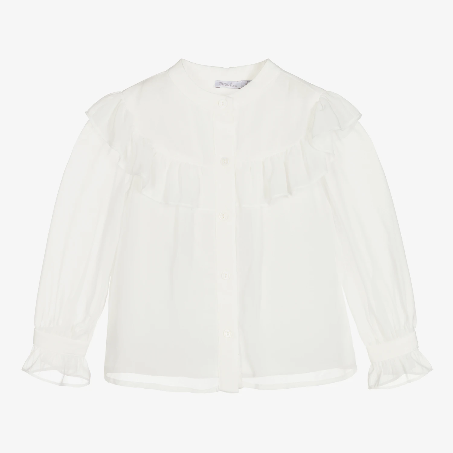 In pale ivory, this smart chiffon blouse for girls is by Patachou. It has sheer sleeves and elegant ruffle trims. Lined in lightweight cotton, it fastens with buttons on the front.
