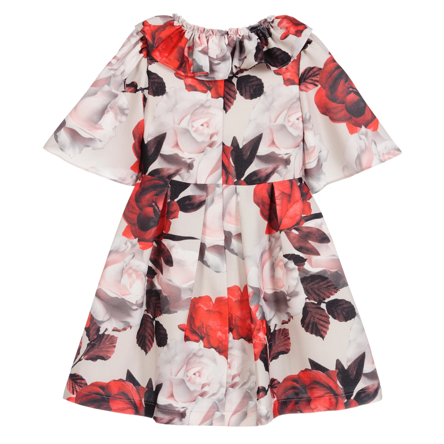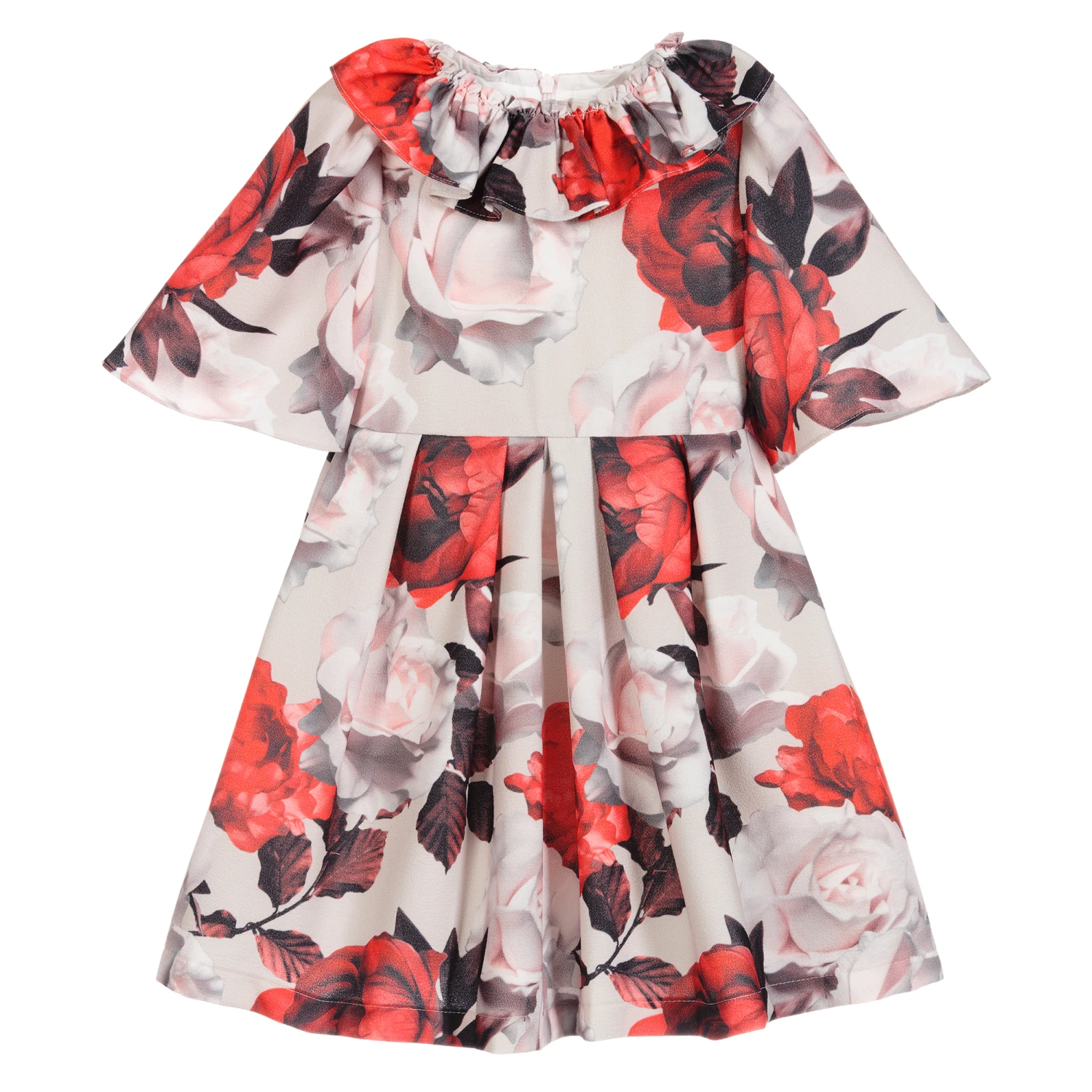 Girls pink and red floral dress by Patachou. It has a ruffled collar and pleated skirt with zip fastening on the back.