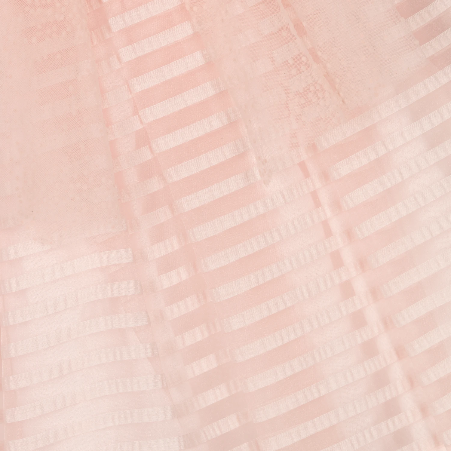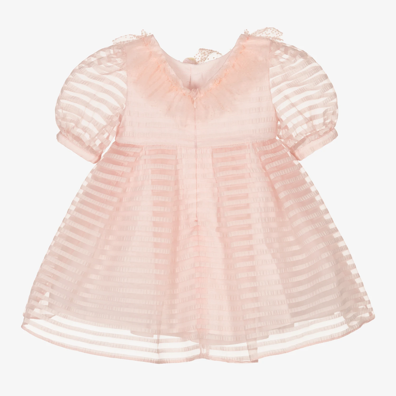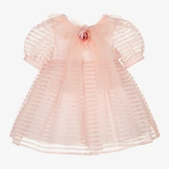 Classic pink dress for girls by Portuguese brand Patachou, made in striped organza, and lined in soft voile for comfort. Ideal for special occasions, it has sheer puff sleeves and a flower appliqué, with dotted tulle detailing around the collar. There is a concealed zip fastening on the back.