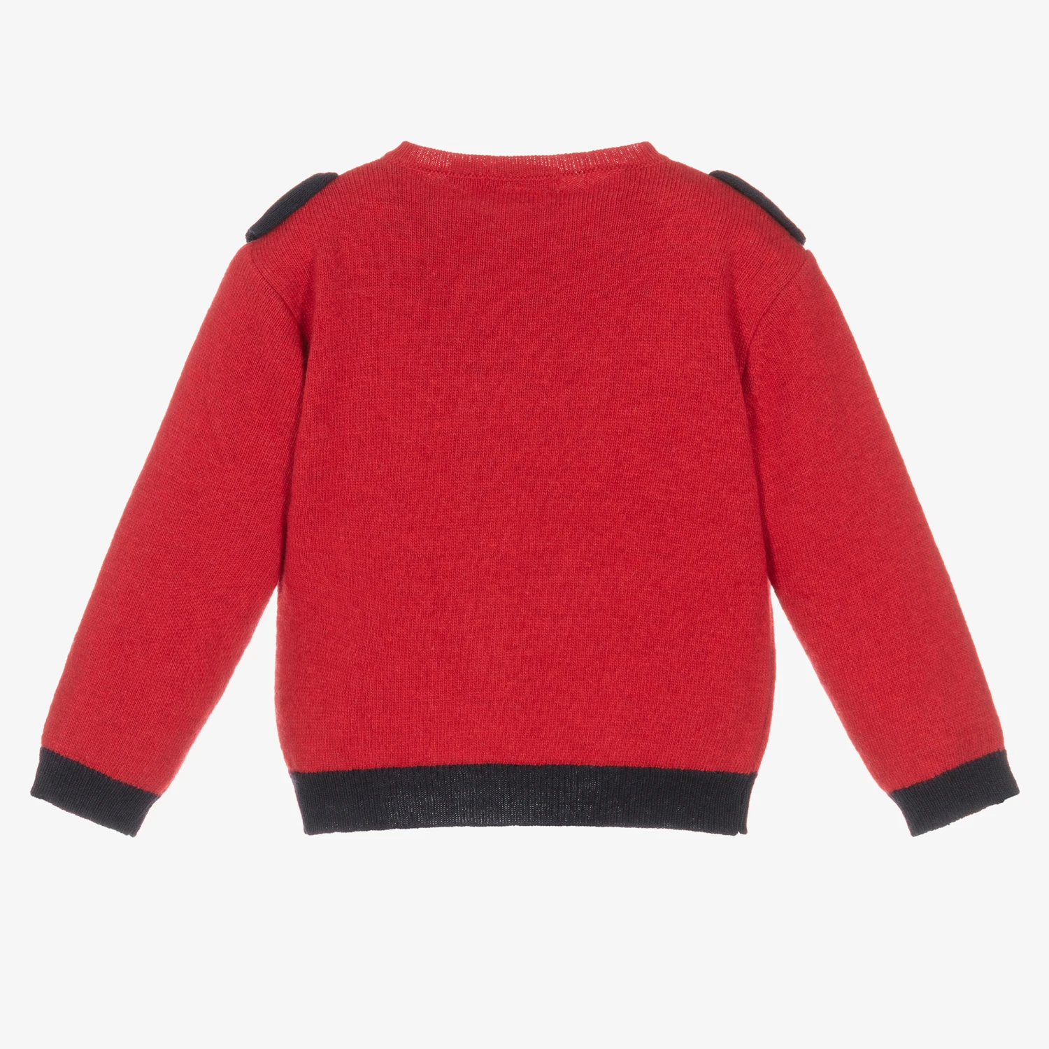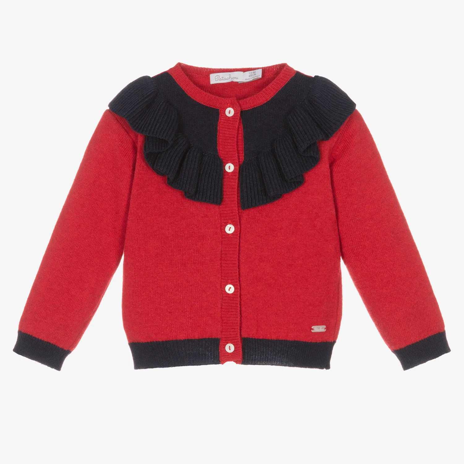 Girls red cardigan by Patachou, with a smart navy blue ruffled bib and contrast hem and cuffs. Knitted in a luxurious blend of cashmere, Merino wool and viscose, there are small buttons to fasten down the front.