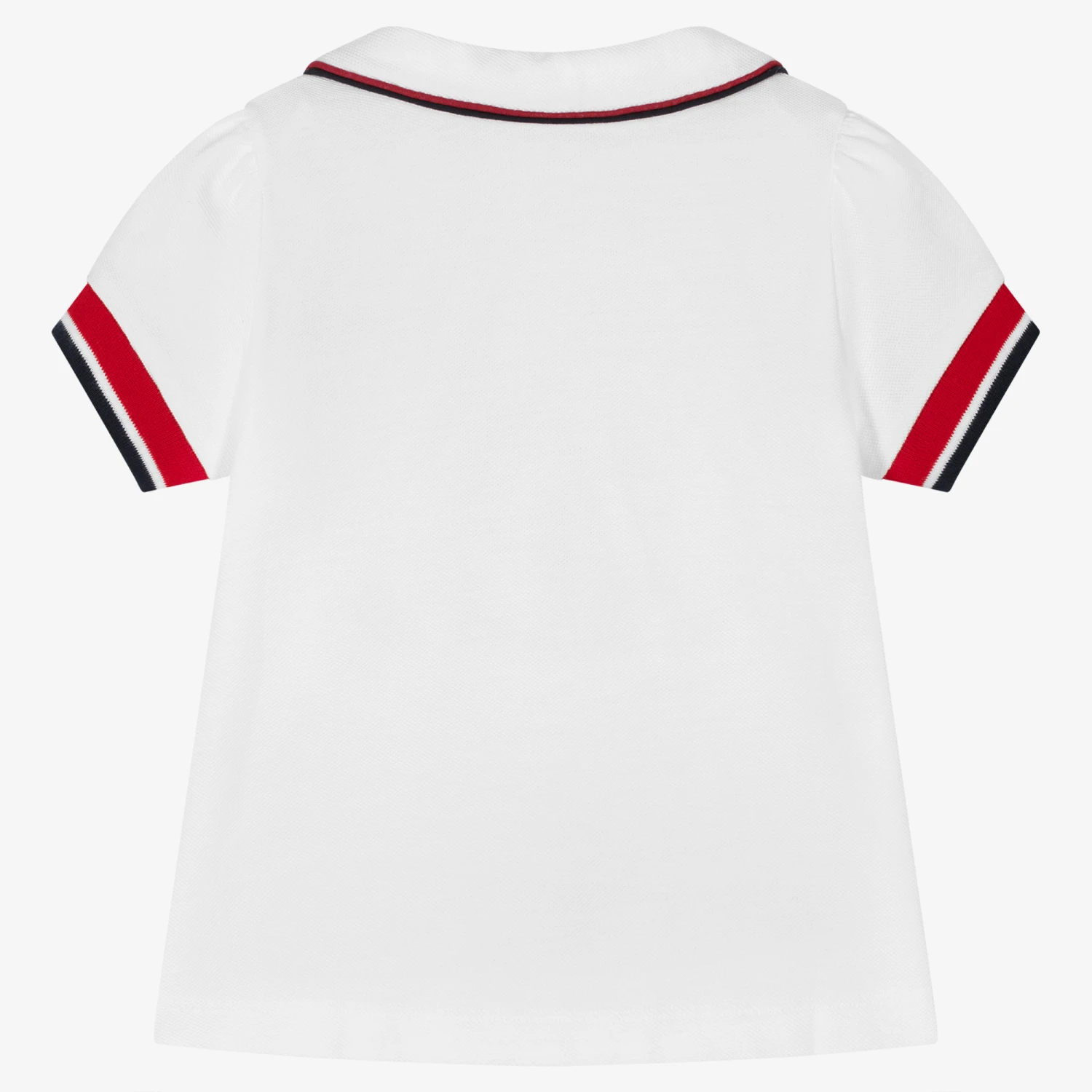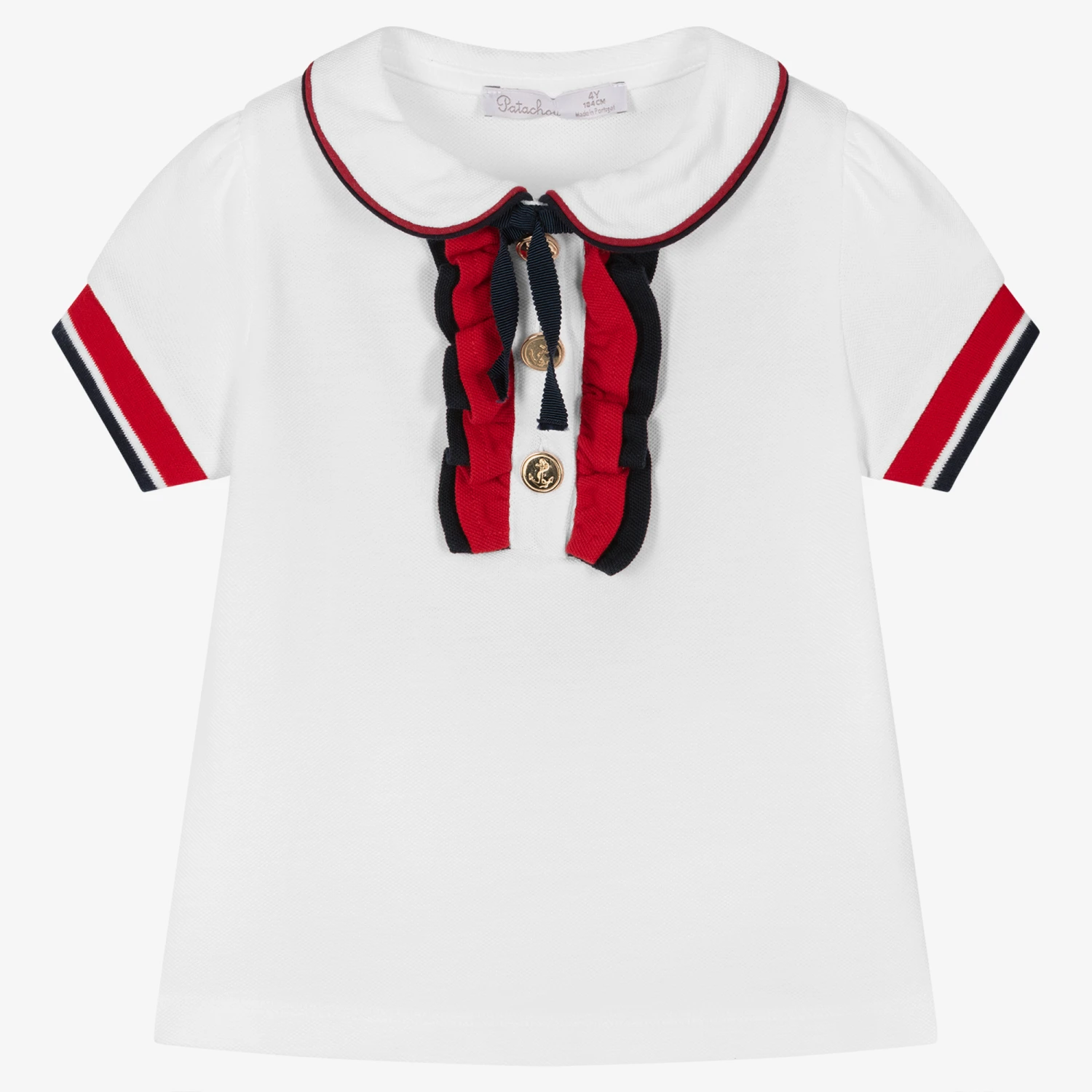 White nautically-inspired cotton polo shirt for girls by Portuguese brand Patachou, made in comfortable piqué with navy blue and white striped trims. Traditional but with a modern twist, the top has a rounded collar and frilled edges on the placket. It has feminine, puffed sleeves and fastens with shiny gold buttons, embossed with anchors.