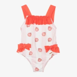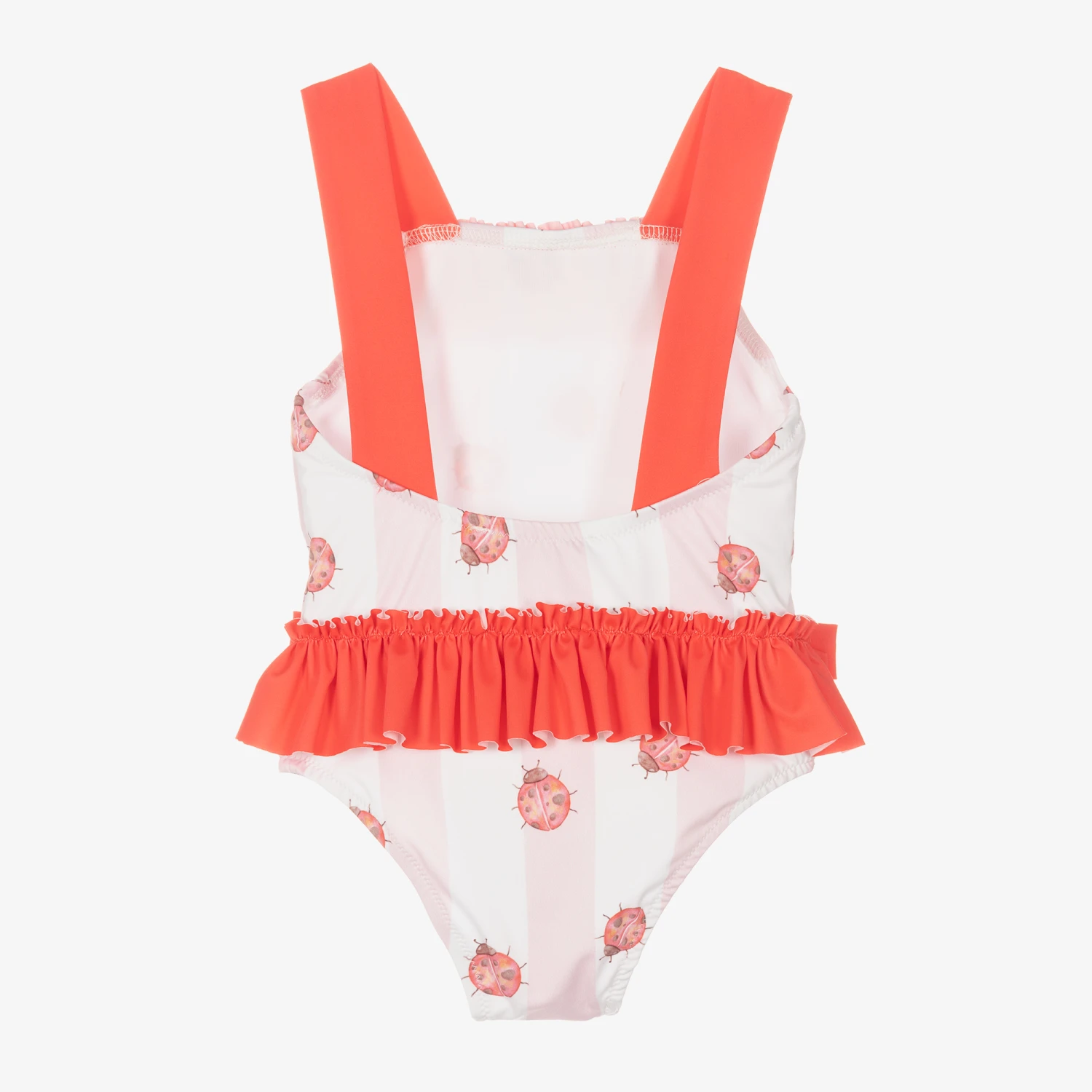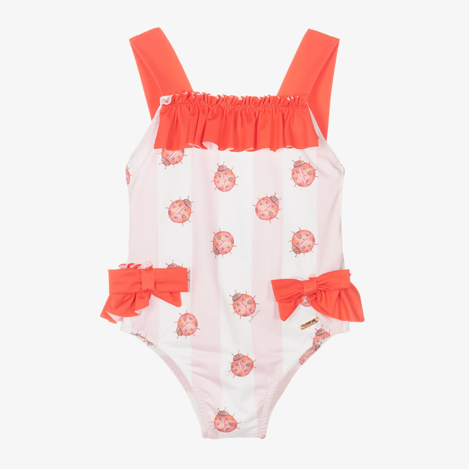 Pink and white striped swimsuit for girls from Portuguese brand Patachou. Fully lined for added comfort and modesty, it is silky smooth and stretchy for quick dressing and a secure fit. It has a beautiful ladybird print and fun contrasting red trims including bows on the front for a pretty finish.