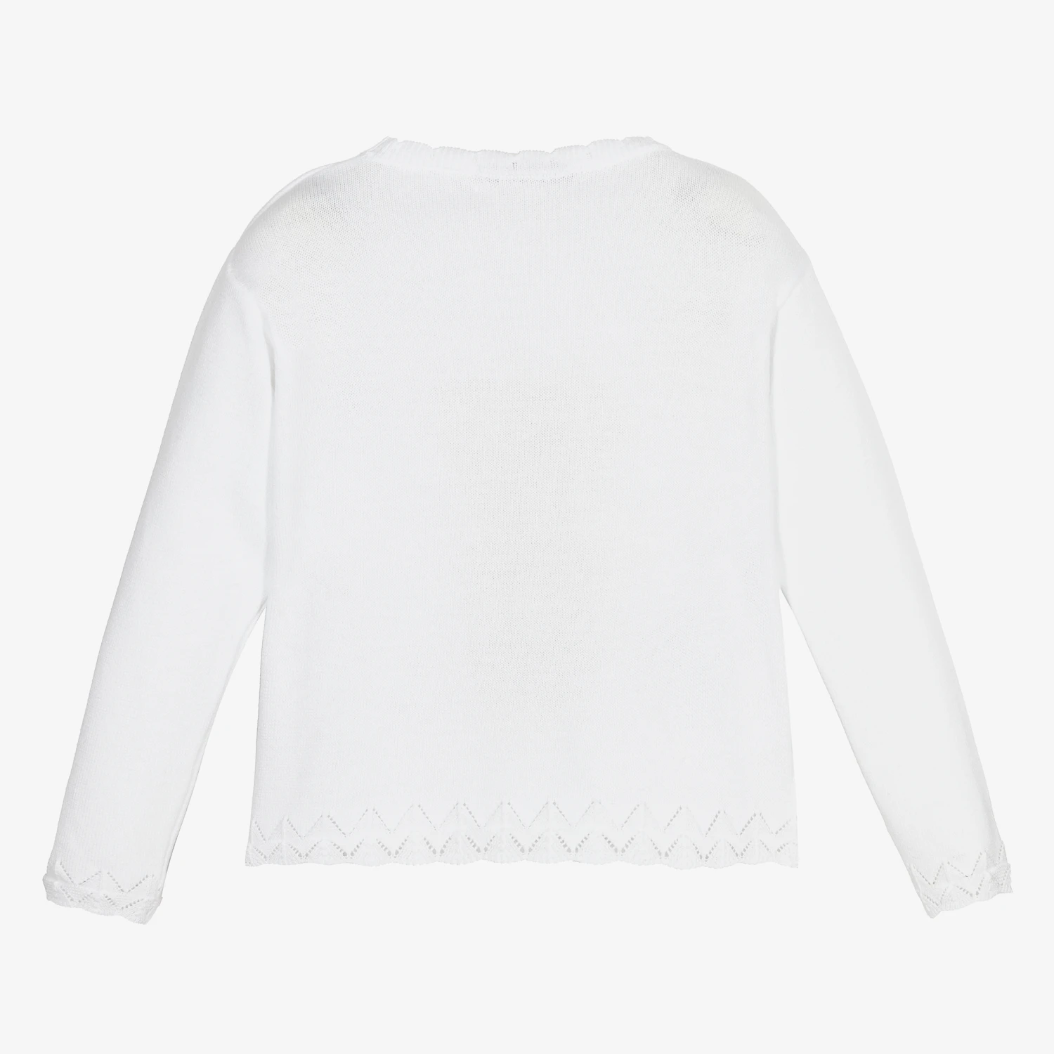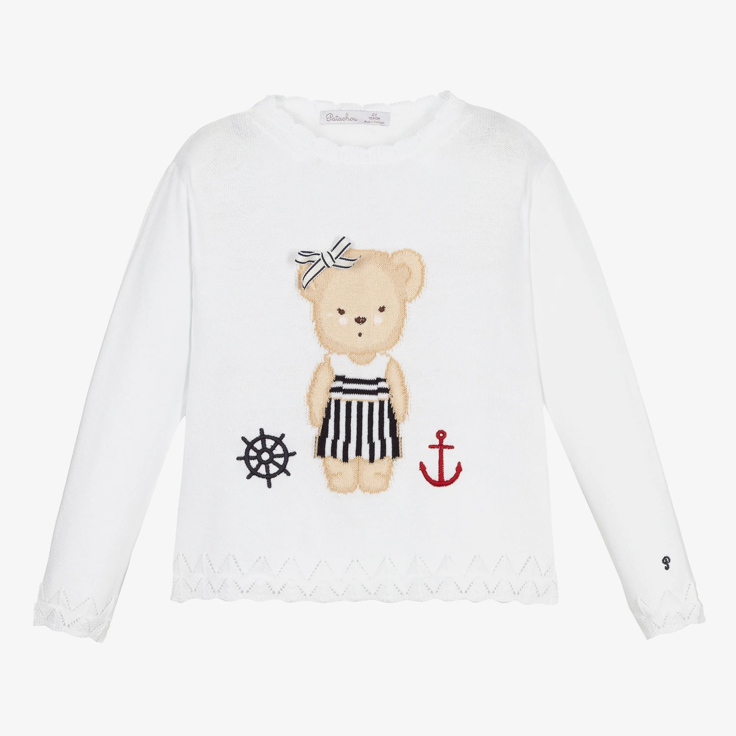 White sweater for girls by Patachou, with a cute beige and navy blue teddy bear on the front. Knitted in lightweight cotton, it has patterned knit trims, an appliqué grosgrain bow and nautical-themed embroidery on the front in navy blue and red. The brand’s logo is embroidered on one cuff.