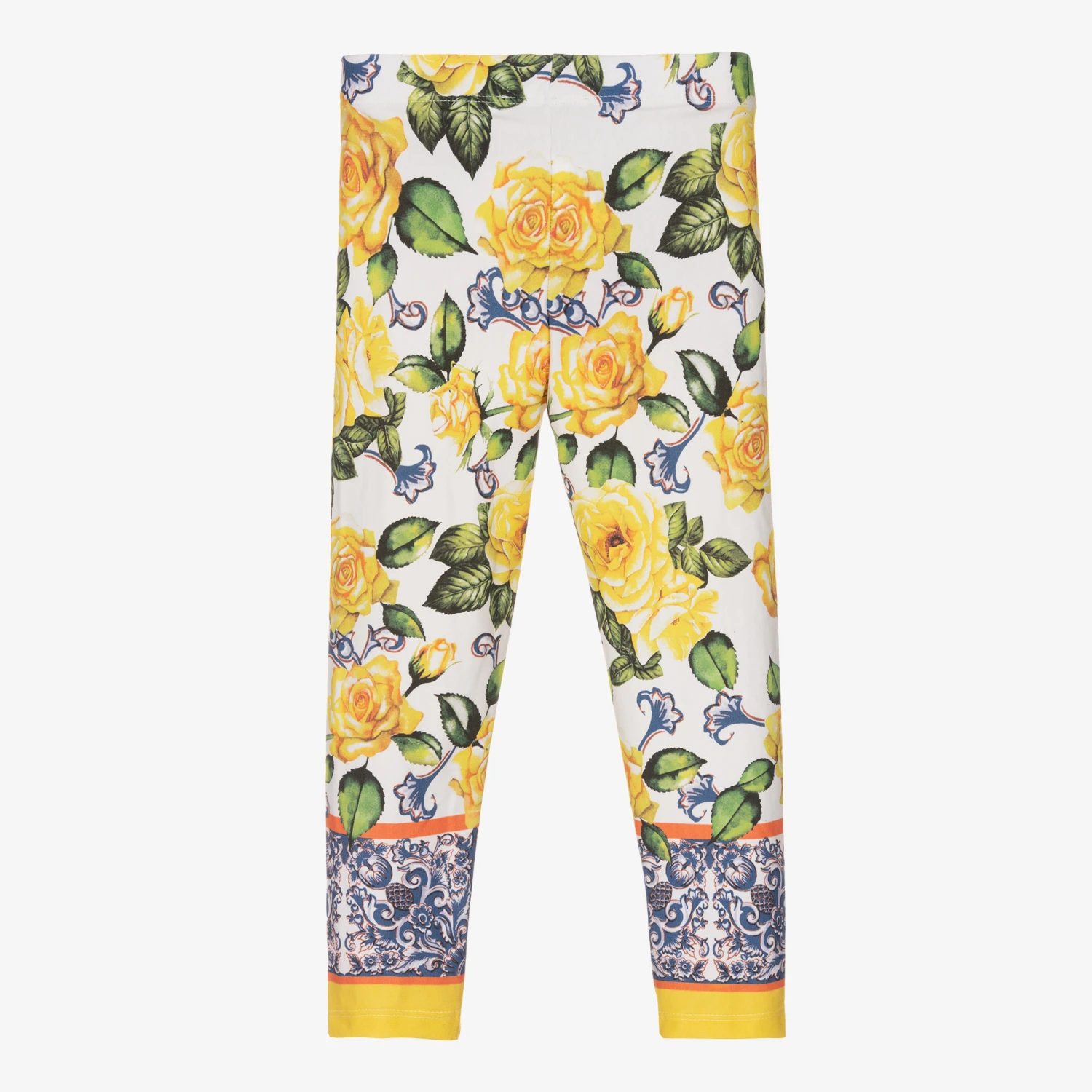 Ivory and yellow floral print leggings for girls by Patachou, with a blue patterned border on the ankles. This pretty full length style is made in soft and stretchy cotton jersey.