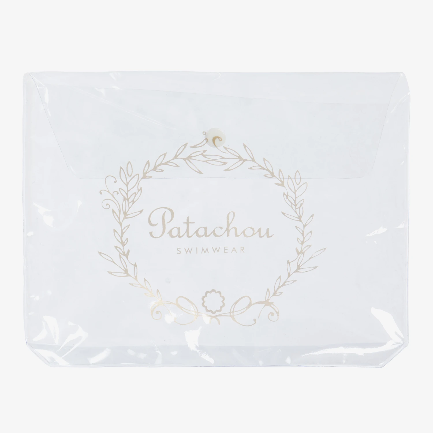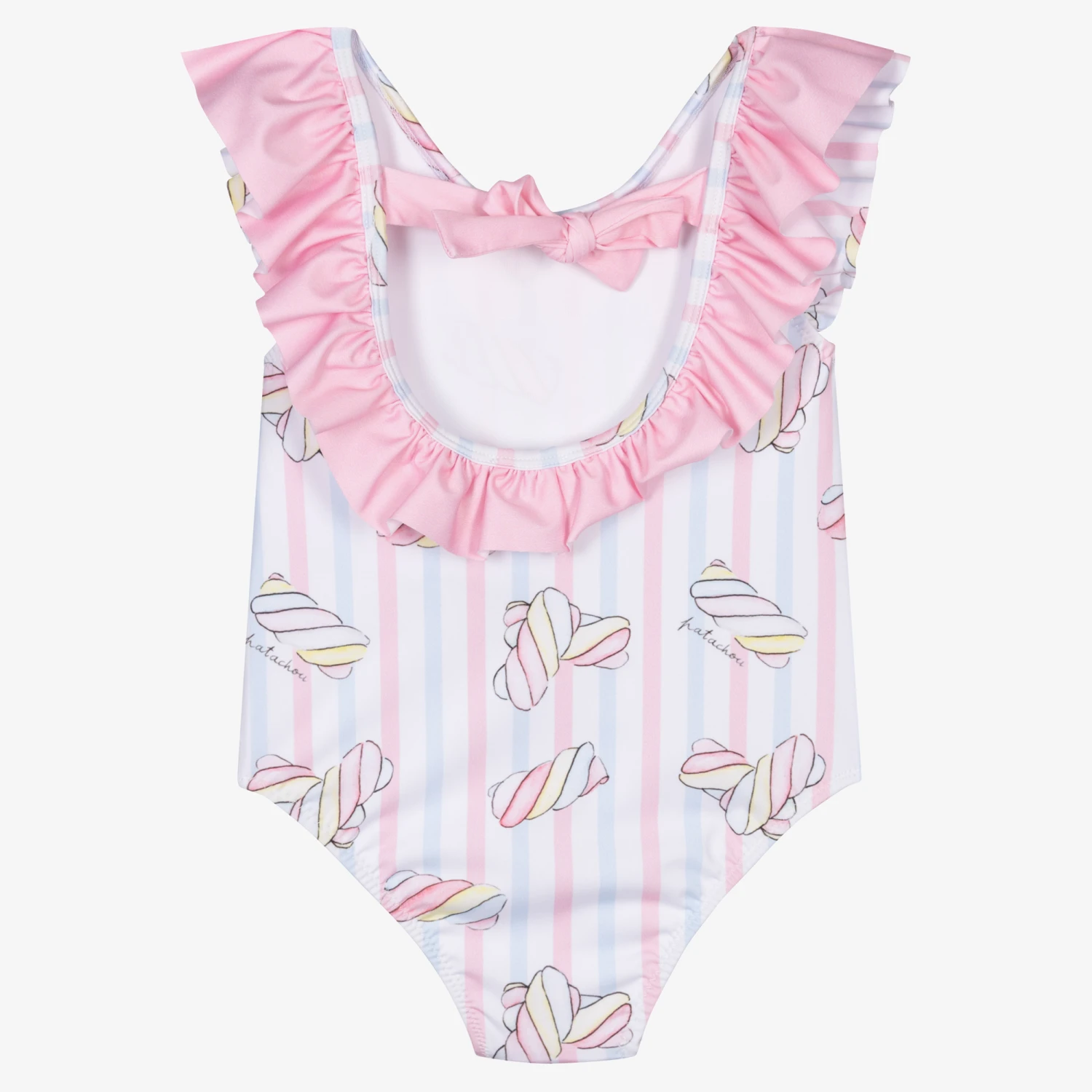 Sweet swimsuit for girls by Patachou, striped in white, pink and pale blue. It has a marshmallow pattern with the brand’s logo, and ruffles around the neckline, over the shoulders and down the back. There are adjustable pink ties that fasten in a bow between the shoulder straps for a good fit. Soft and silky, it has a rose gold metal logo tab by one leg and is fully lined for comfort.