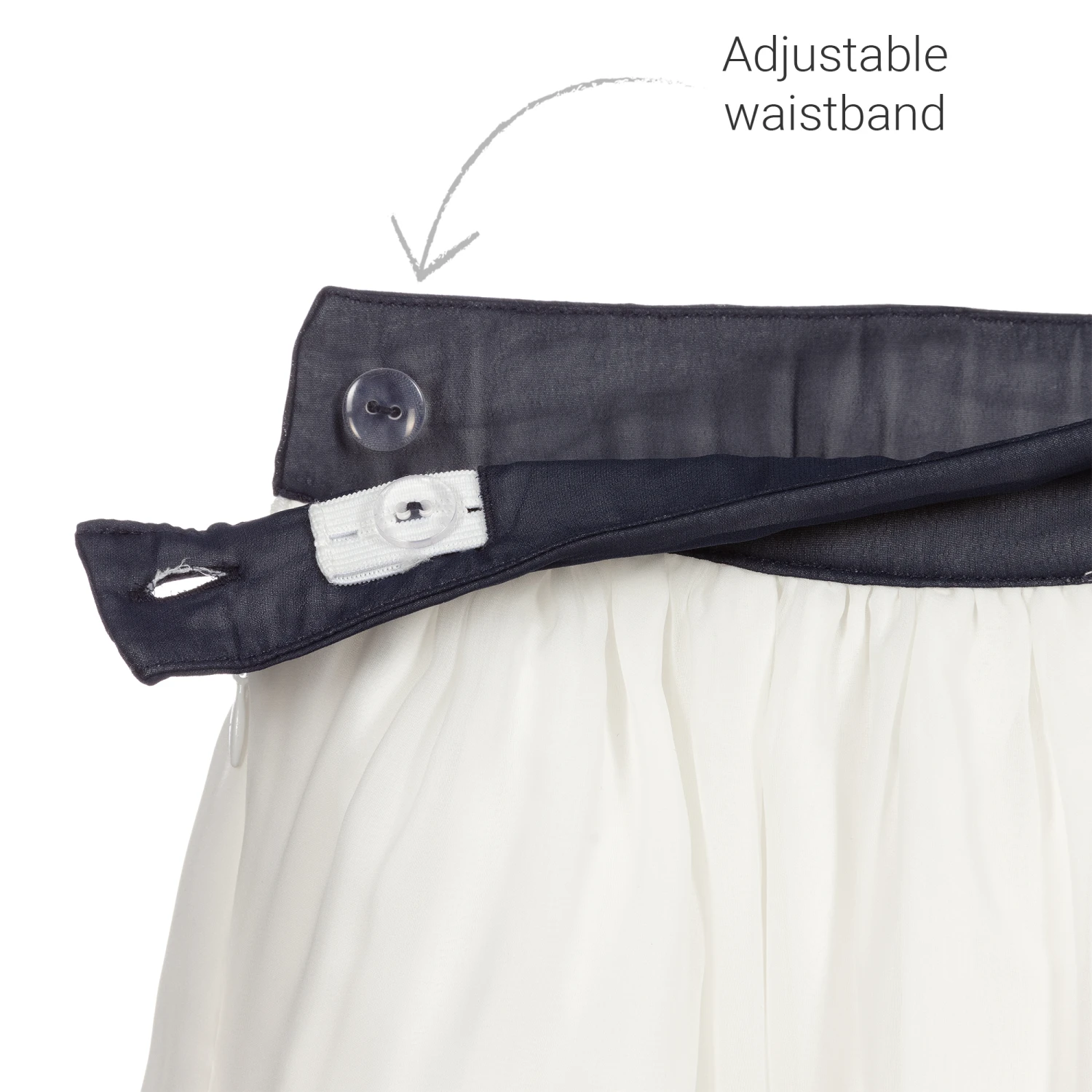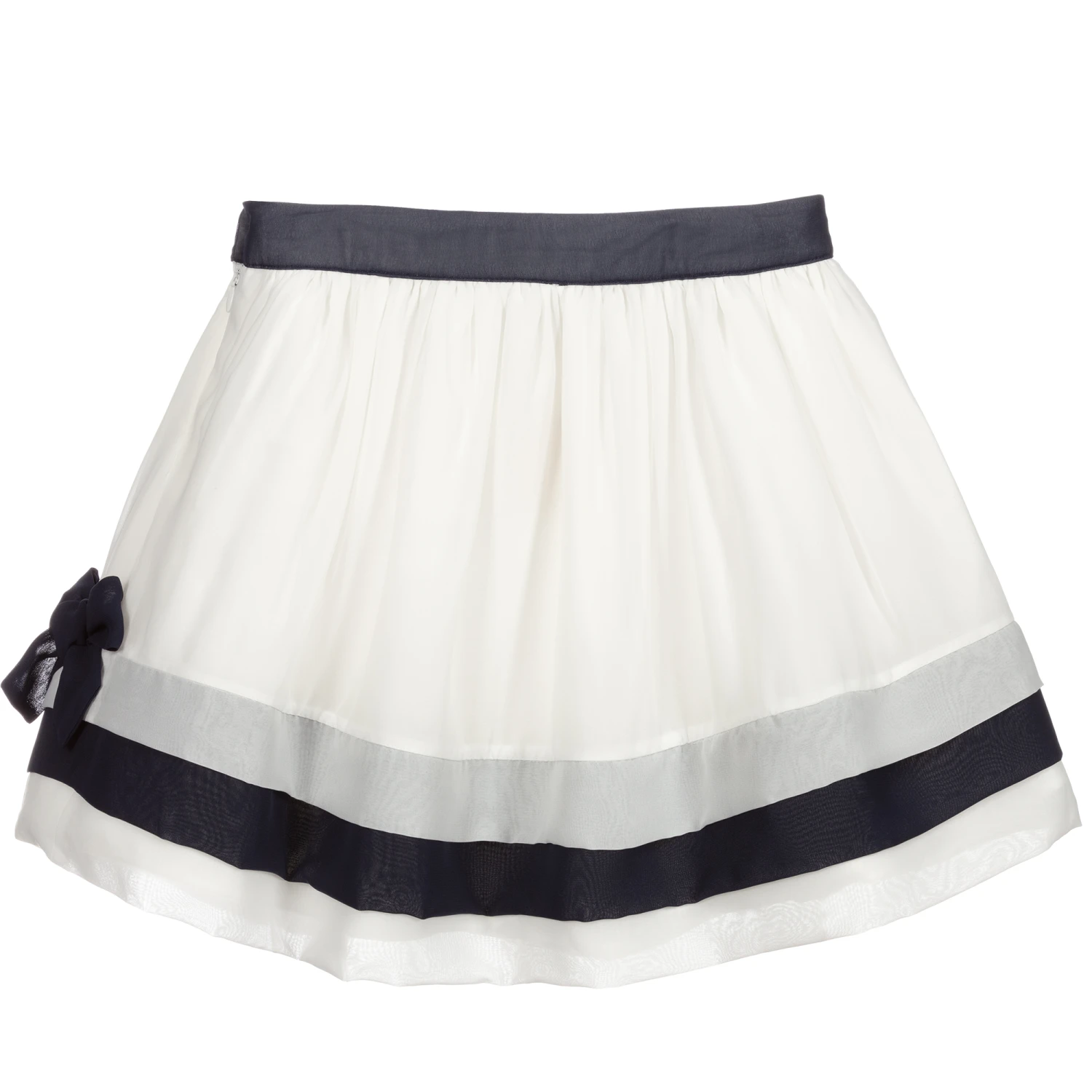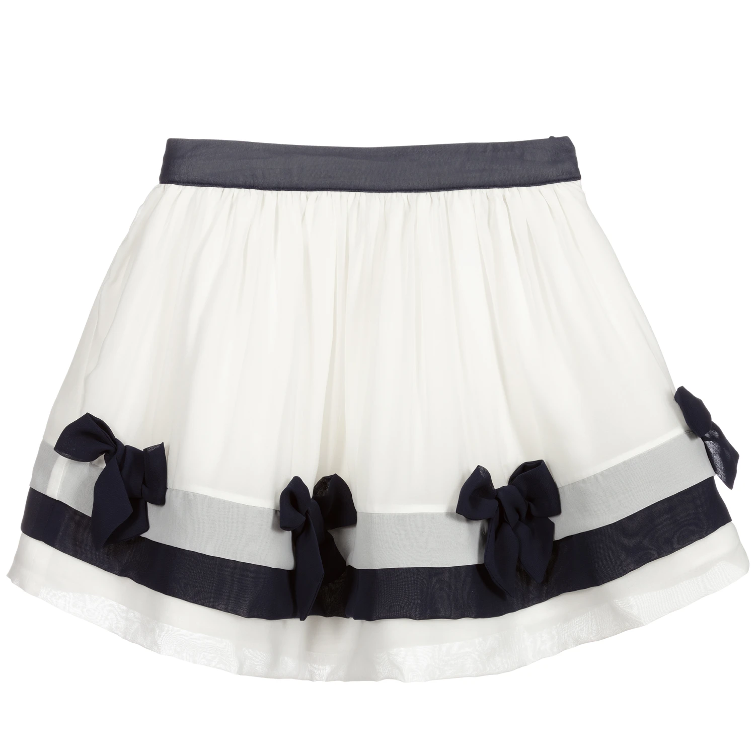 White skirt for girls by Patachou, made in soft, lightweight chiffon, with navy blue trims and bows. It has a double cotton lining, with soft tulle for added volume. It fastens with a button and zip on the side and has a useful adjustable waist.