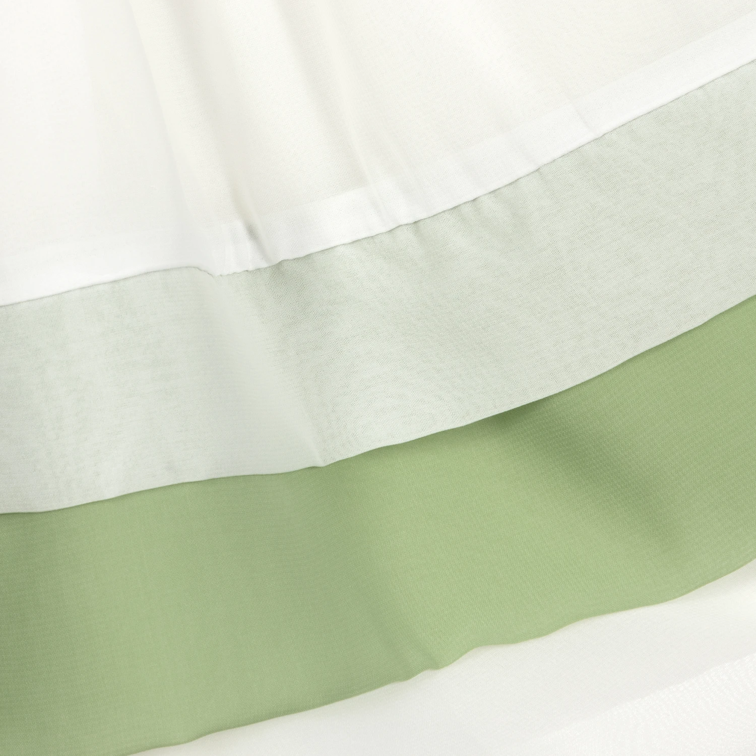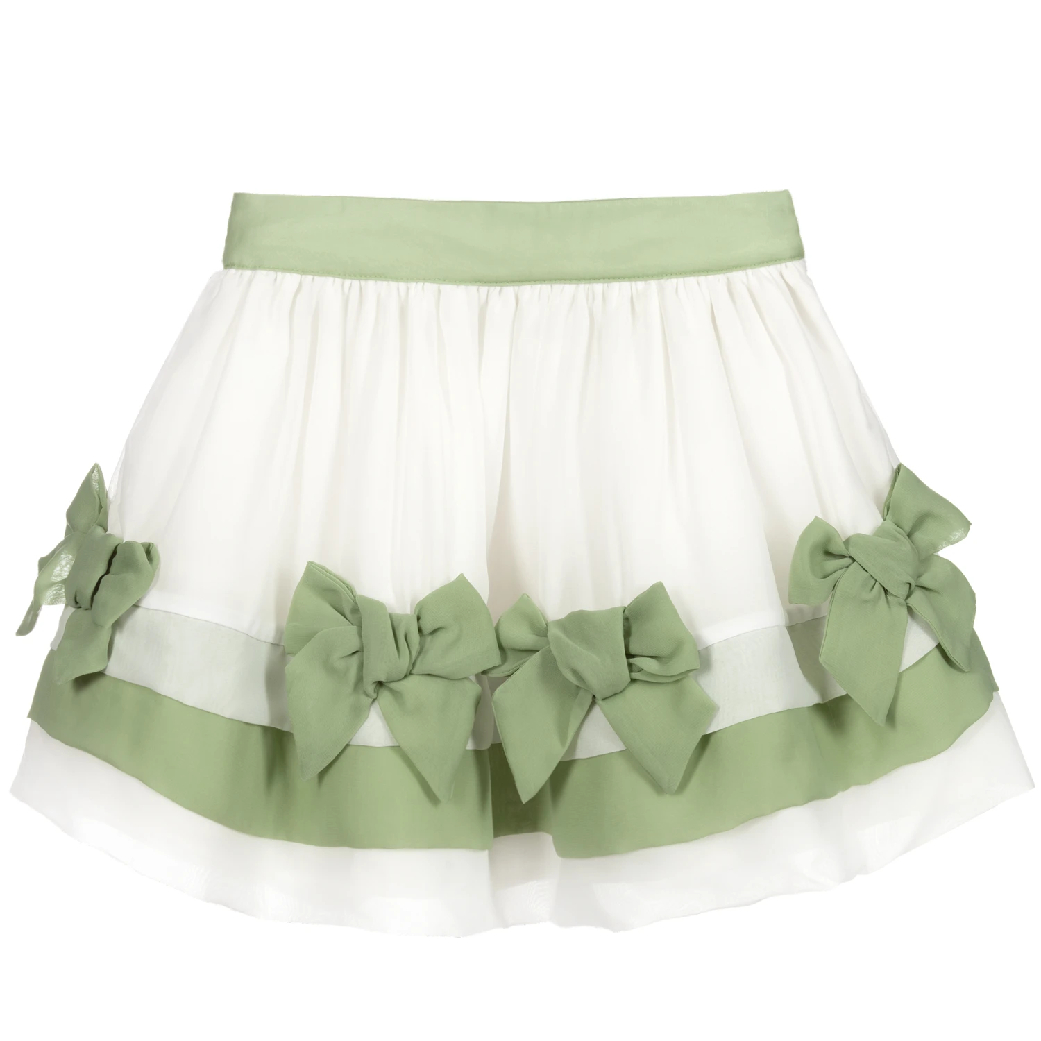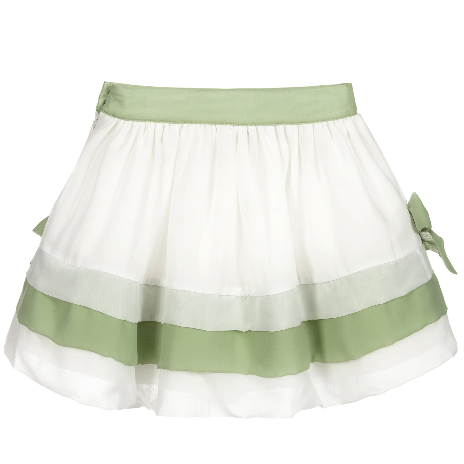 White skirt for girls by Patachou, made in soft, lightweight chiffon, with green trims and bows. It has a double cotton lining, with soft tulle for added volume. It fastens with a button and zip on the side and has a useful adjustable waist.