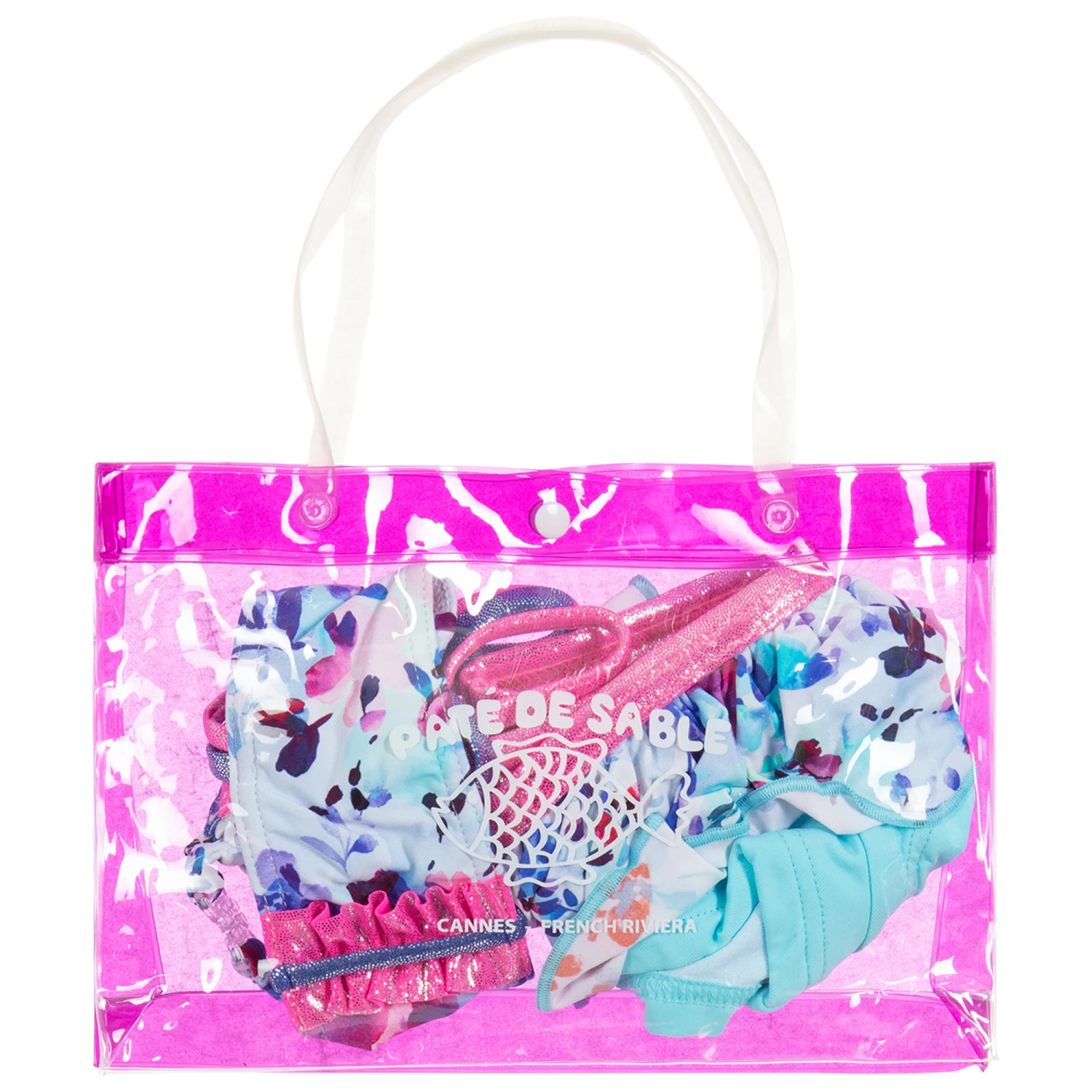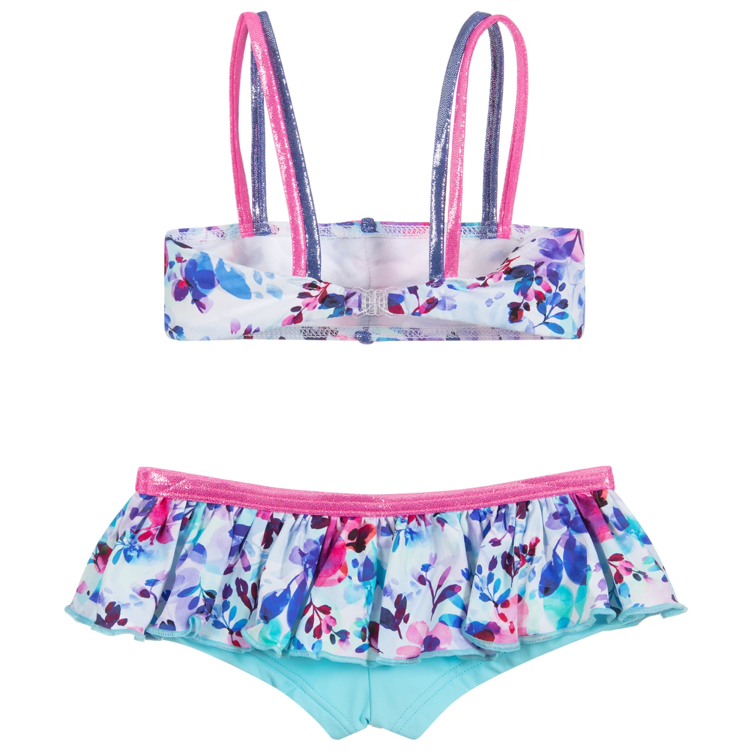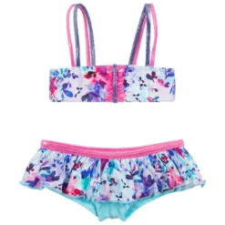 A pretty bikini by Paté de Sable, in a floral print, with glittery pink and purple trim and delicate straps. Made and lined in silky lycra, the light blue bottoms have a floral frill to match the top. The fit can be quite small, so Paté de Sable advises you to choose a size up if you want room to grow.