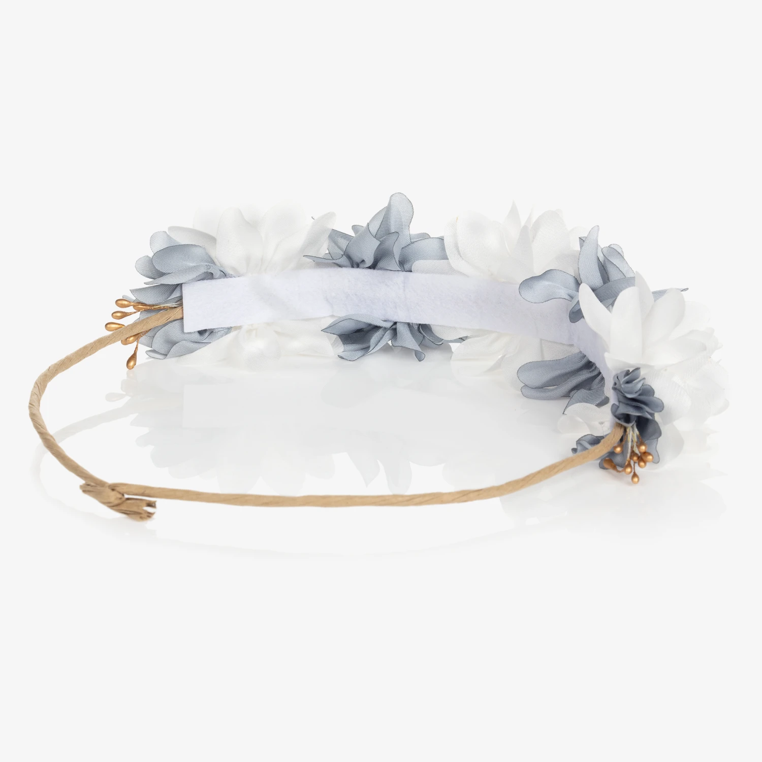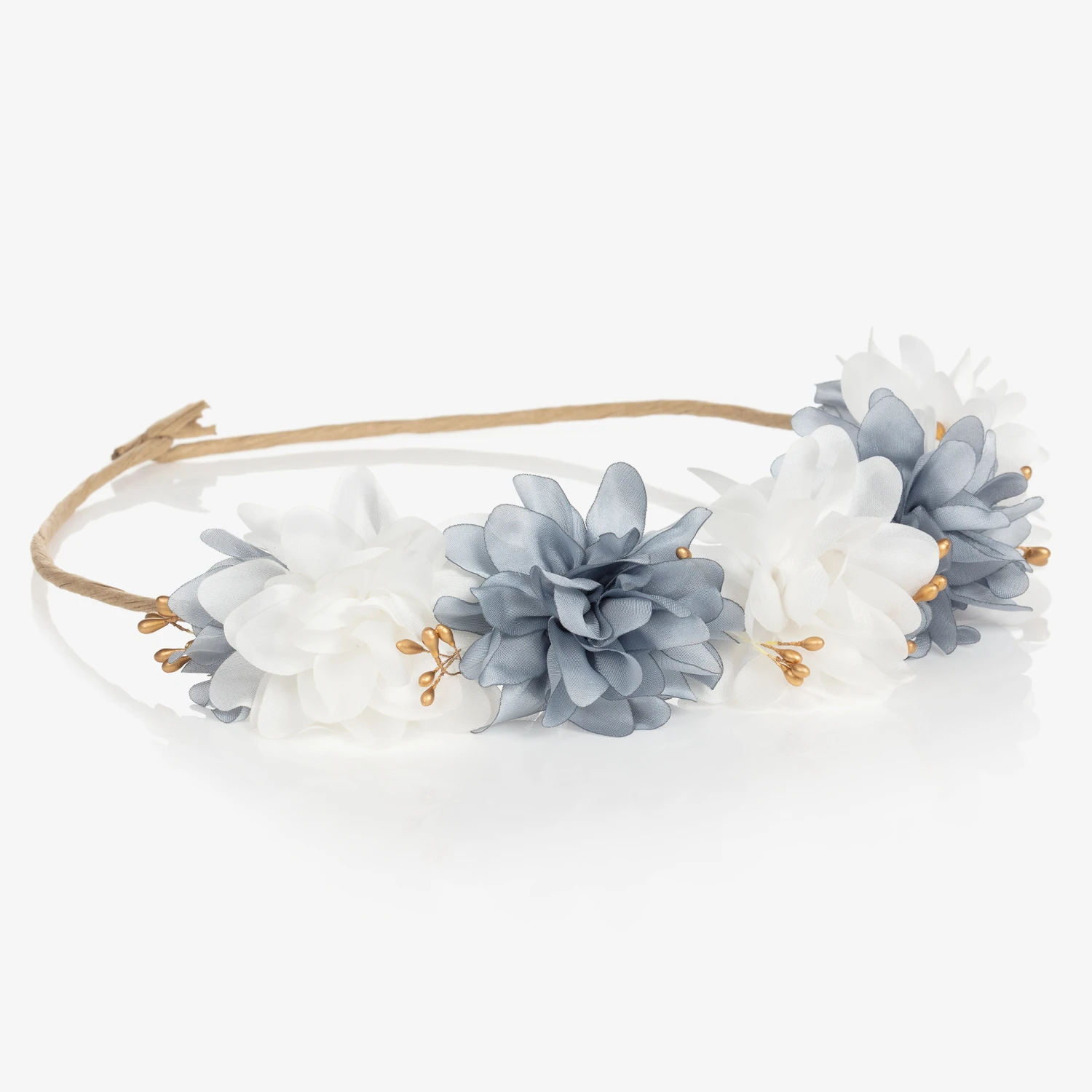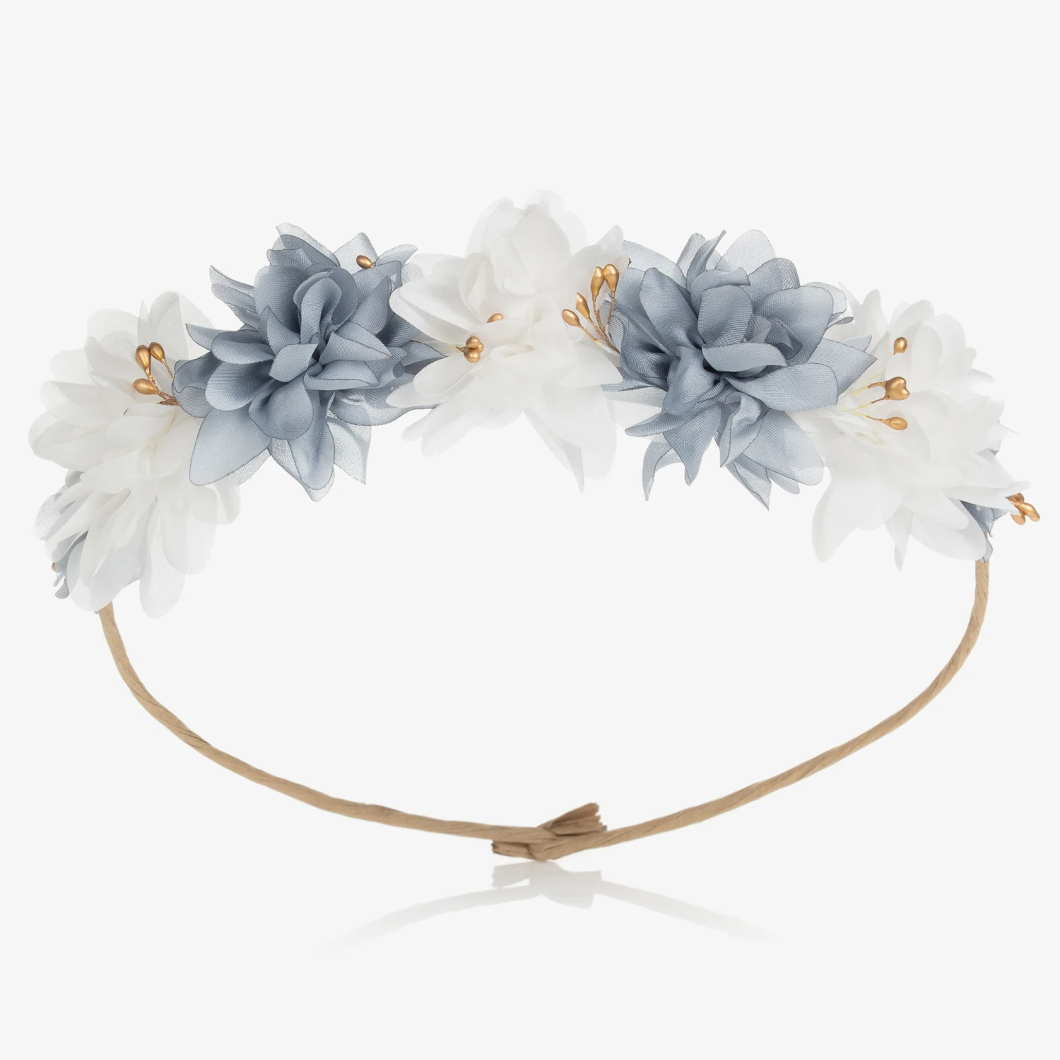 Girls pretty blue garland hairband by Paz Rodriguez, with lovely blue and white flower decorations. These decorations are placed on a rigid straw band, for a bohemian look.