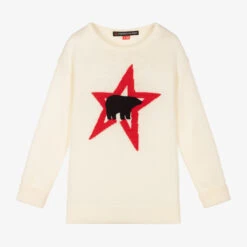 Ivory knitted jumper for boys and girls from French brand, Perfect Moment. Made in soft, extra fine Merino wool, it is patterned with the designer’s signature red star, together with the popular navy blue polar bear appliqué in soft bouclé.