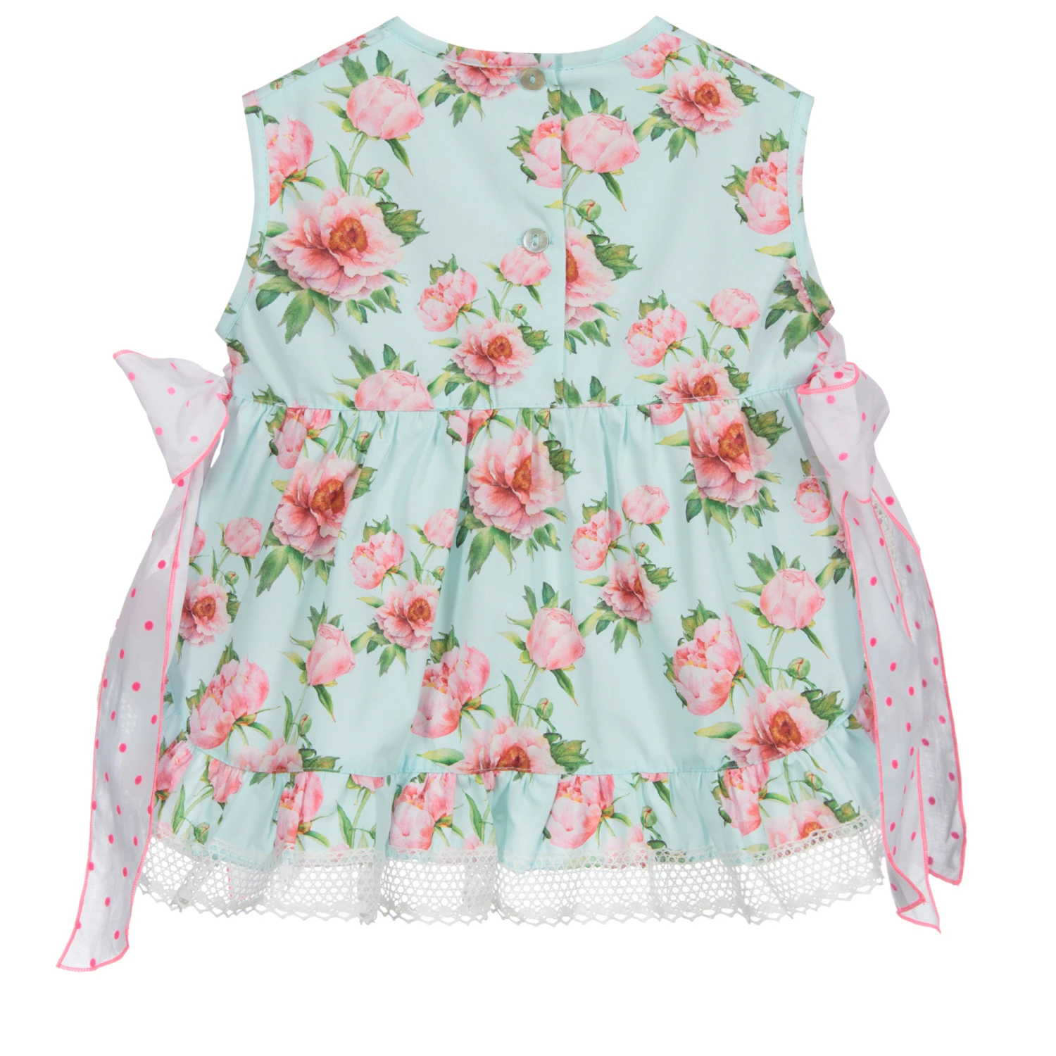 Blue blouse for girls by Phi Clothing, made in soft, lightweight cotton, with a pink and green floral print. It has a white lace trim and white and pink spotted bow trims at the sides.