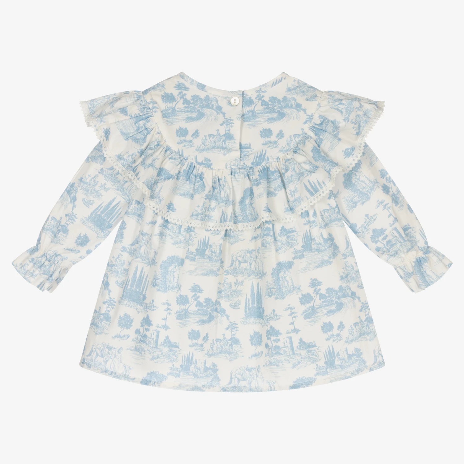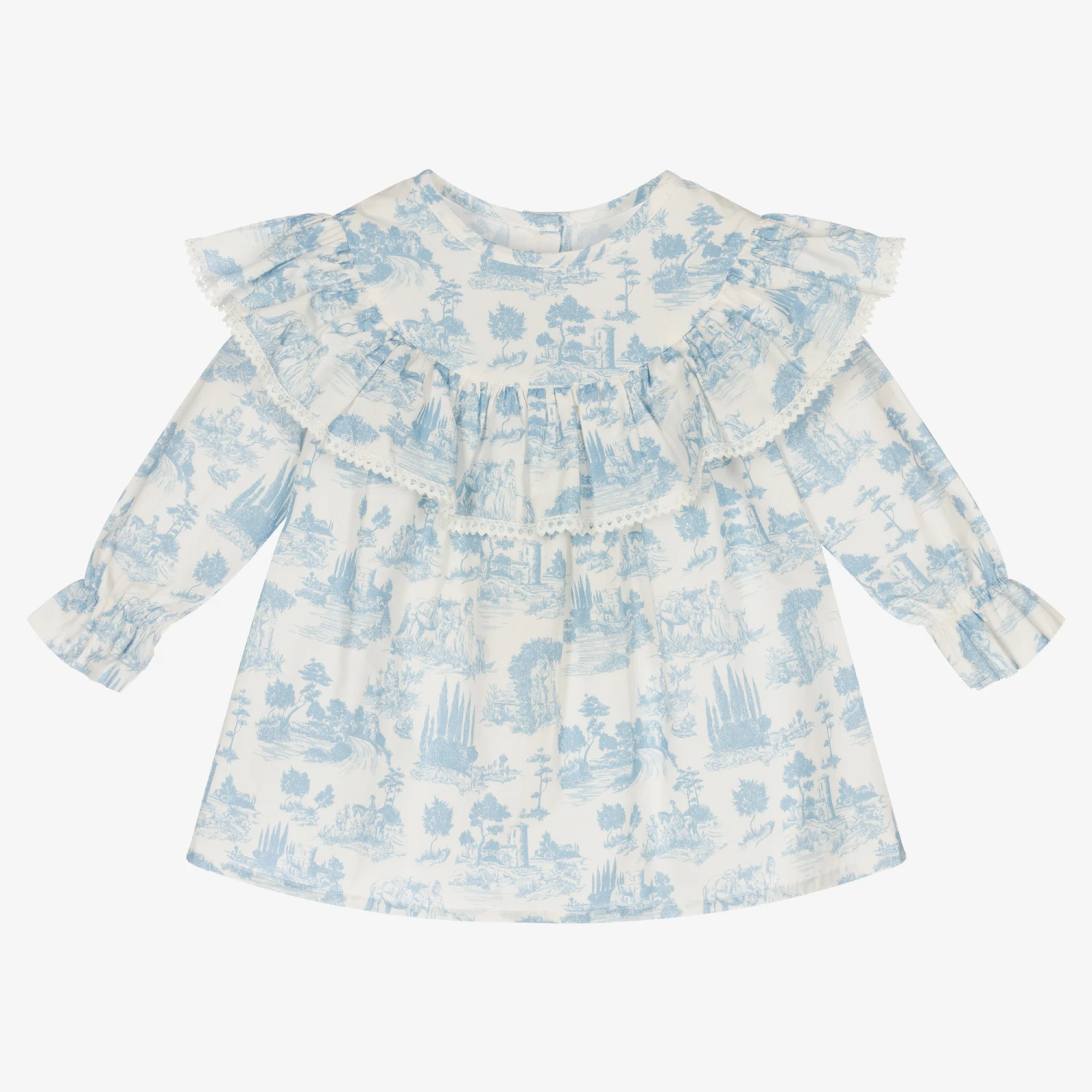 Ivory ruffled cotton poplin blouse for girls by Phi Clothing, printed with a delicate blue toile de Jouy pattern. It is trimmed with white ric rac and fastens with shell buttons on the back.