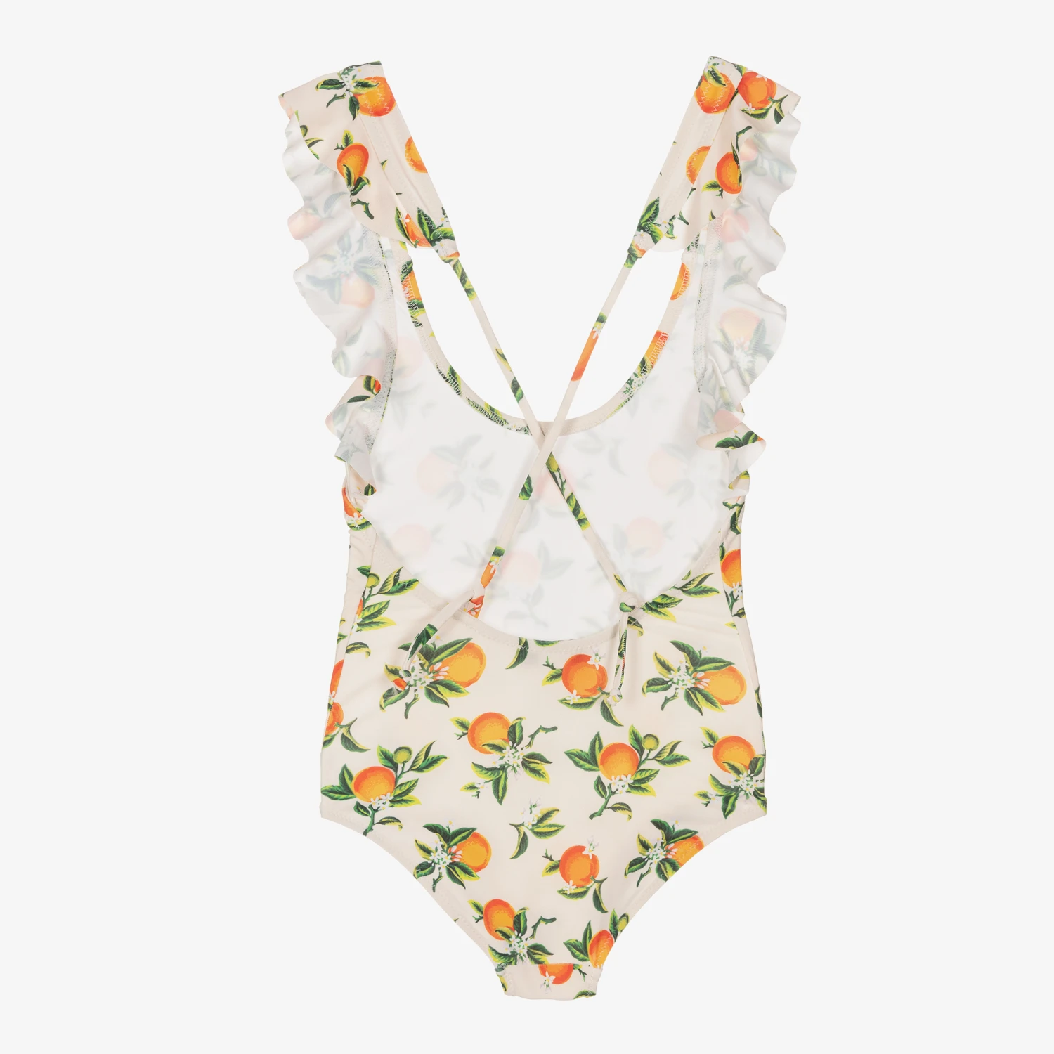 Girls ivory swimsuit by Phi Clothing, patterned with a vibrant orange print. Silky smooth and stretchy, it has pretty ruffle trims and adjustable, cross-over shoulder straps that tie securely on the back. It is fully lined for added comfort and skin protection.