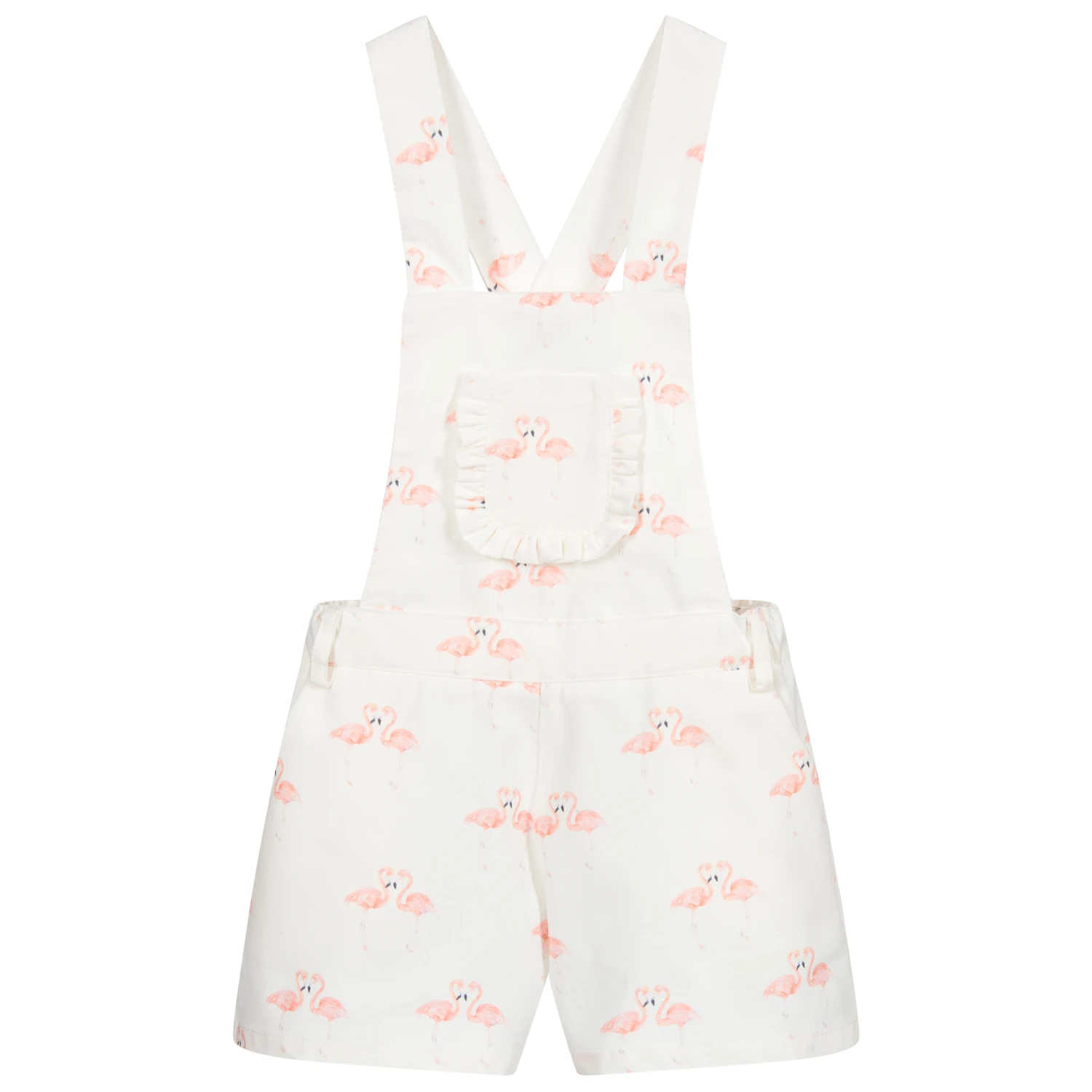 Midweight ivory twill short dungarees for girls by Phi Clothing. These dungarees are patterned with pink flamingos and there is a singular pocket on the front with a frilly trim. They have an adjustable waist and shoulder straps that are fastened by buttons on the back.