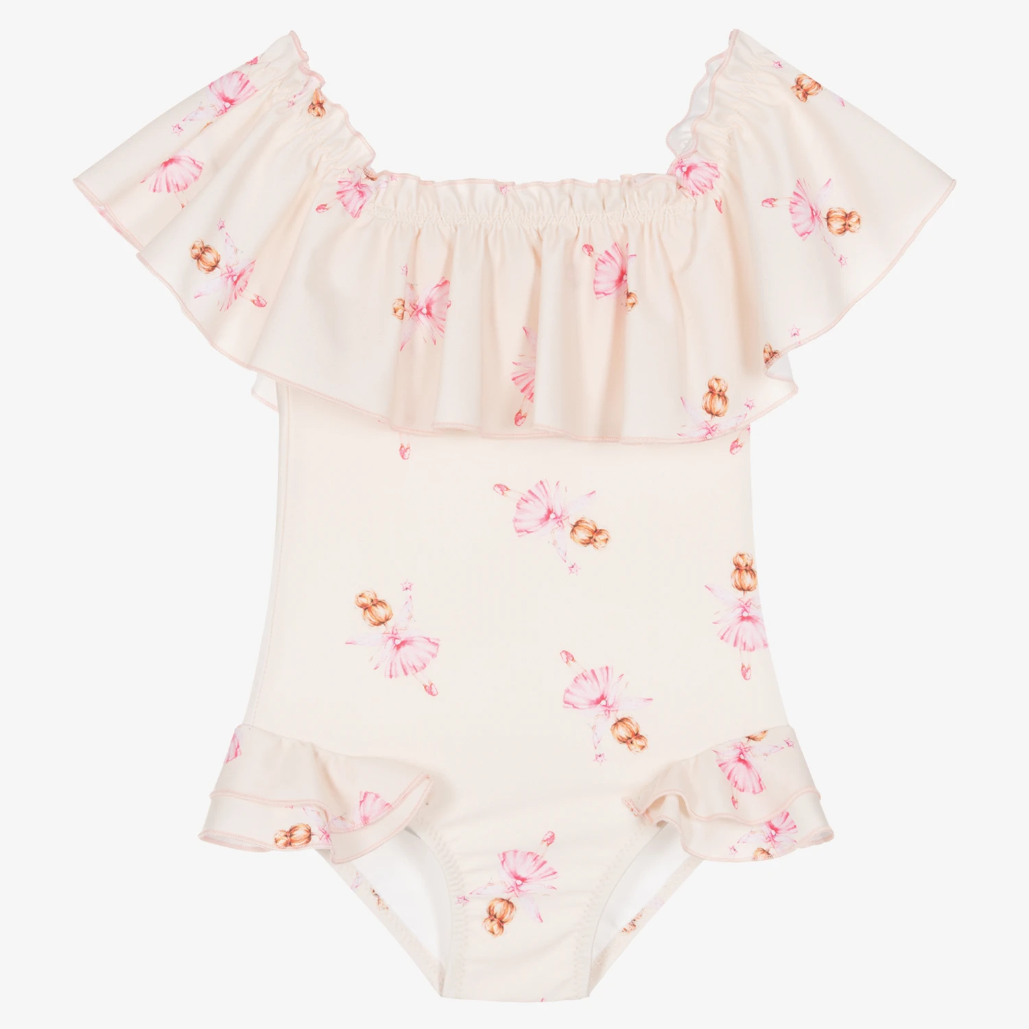 Silky soft and stretchy, this light blush pink swimsuit for girls is designed by Phi Clothing, with a sweet ballerina fairy print. It has a large, elasticated frill around the top which can be worn on or off the shoulders, and layered ruffles on the hips. Ideal for the pool or a day at the beach, it is fully lined for added comfort.