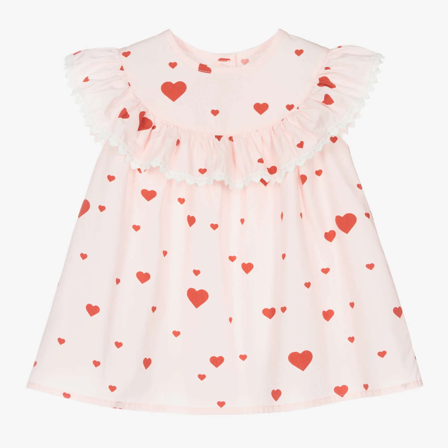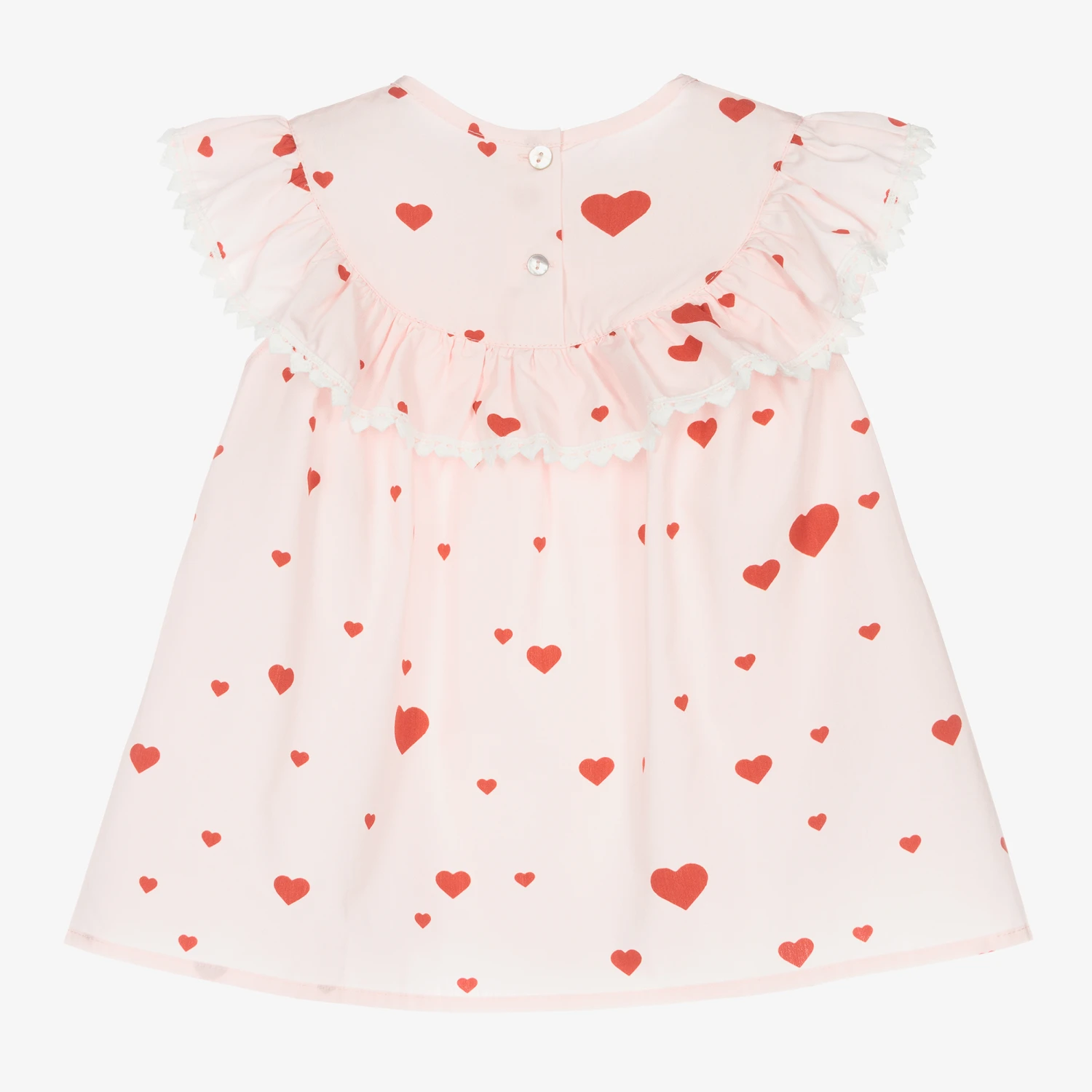 Lovely pink blouse for girls by Phi Clothing, patterned with red hearts. Made in soft, lightweight cotton sateen, it has a ruffle around the bodice and over the shoulders with white heart-shaped trims. The blouse fastens with mother-of-peal buttons on the back.