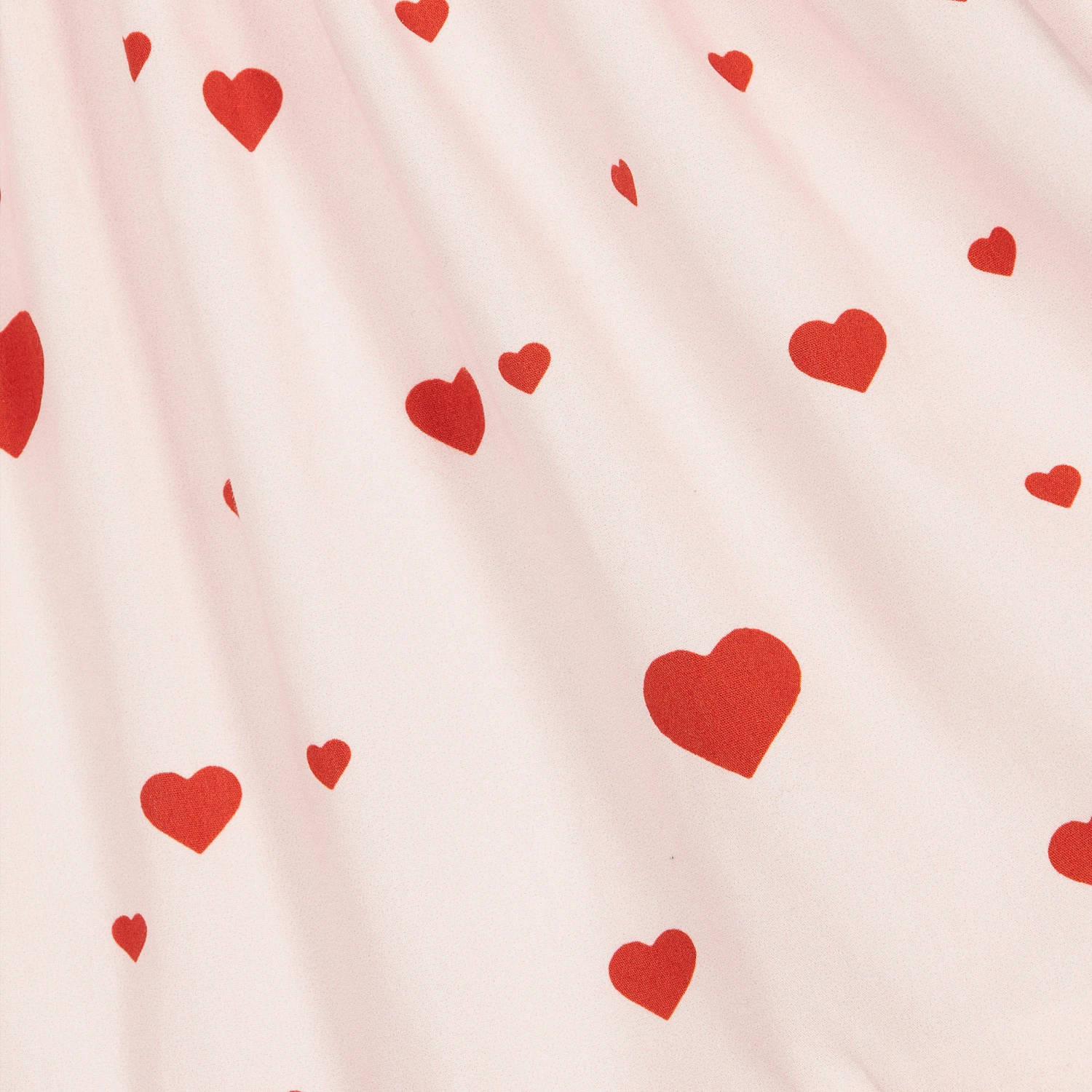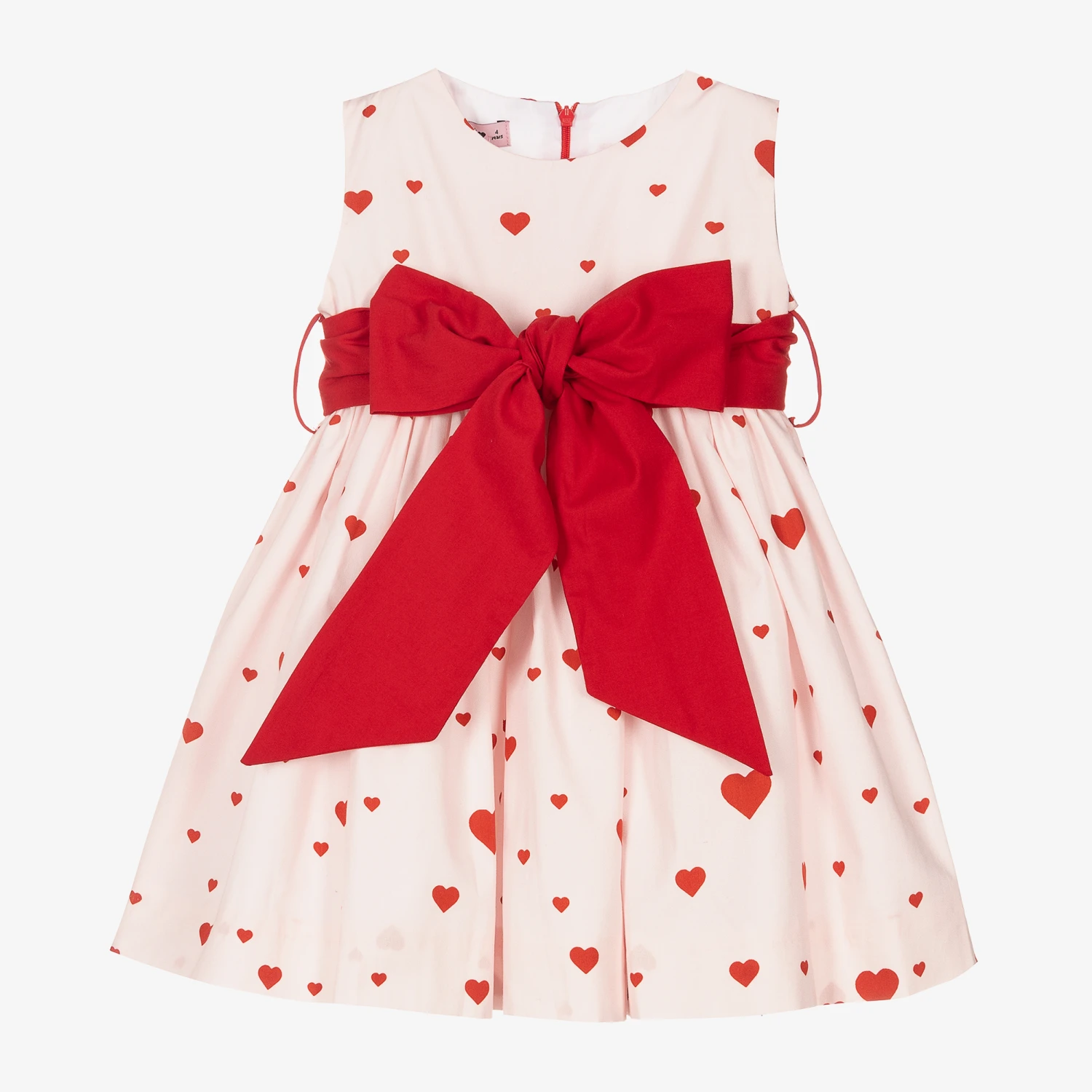 Lovely pink dress for girls by Phi Clothing, patterned with red hearts. Made in soft, lightweight cotton sateen, it has a red sash around the waist that ties in a large bow. Lined in voile for comfort, it has a full, gathered skirt.