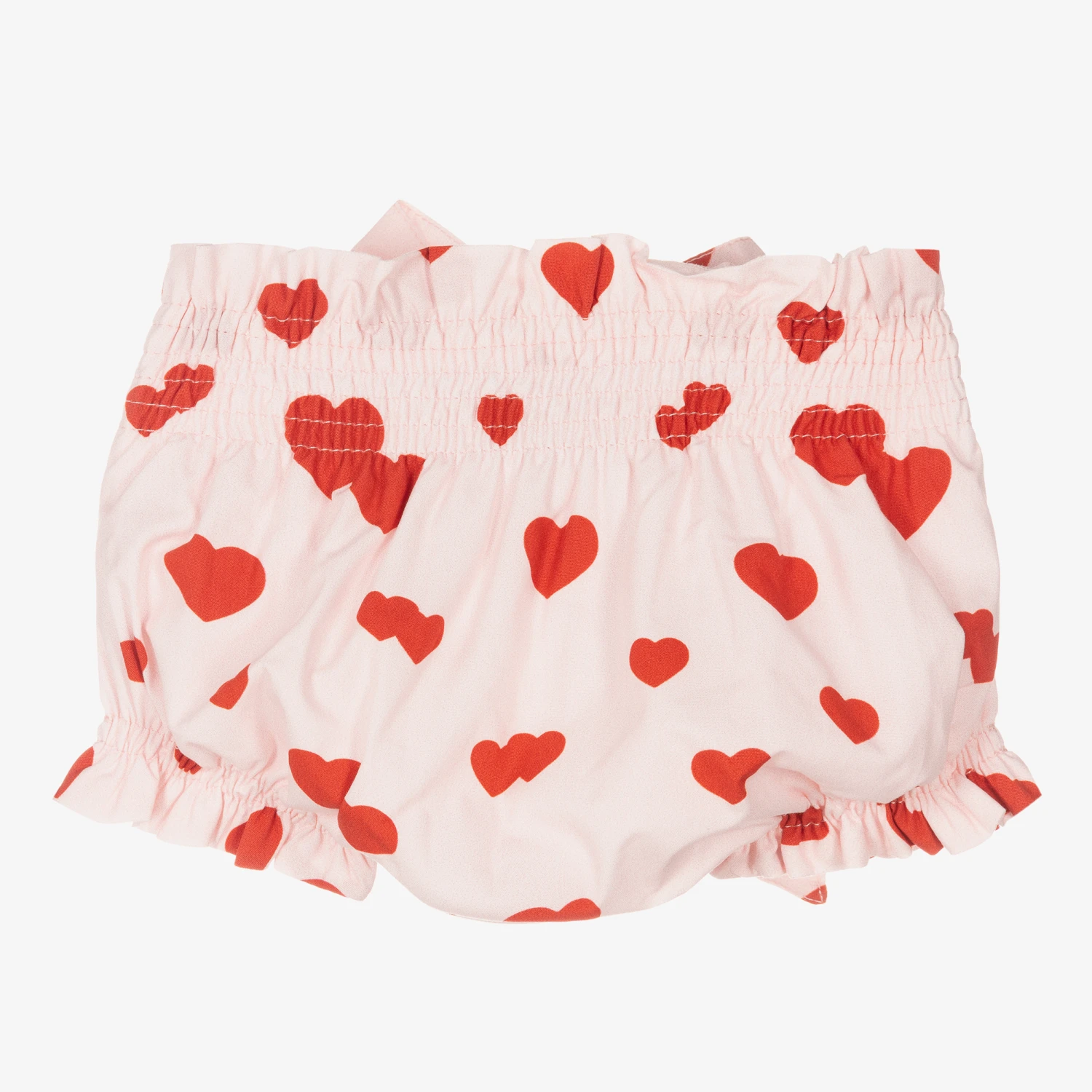 Cute pale pink bloomer shorts for little girls by Phi Clothing, woven in lightweight cotton. Patterned with a girly red heart print all-over, they have an eye-catching bow on the back for a romantic finish. Elasticated trims ensure these bloomers are as comfortable as they are cute.