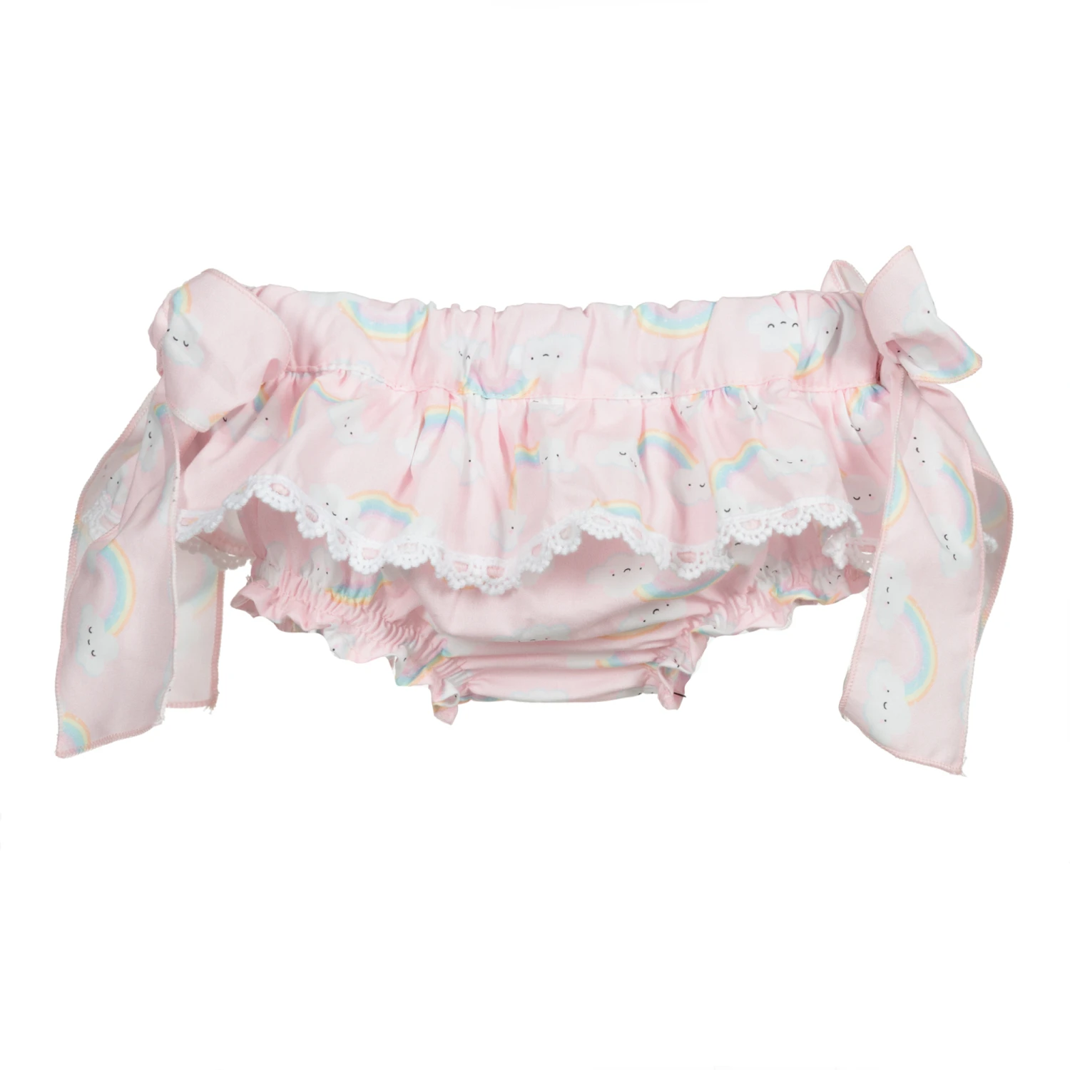Pink bloomer shorts for little girls by Phi Clothing, made in soft, lightweight cotton with a cute rainbow print. They have a pretty lace trim, with bows on the sides and a gently elasticated waist and leg openings.