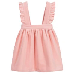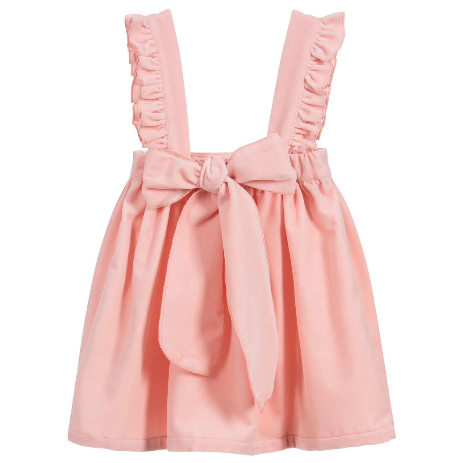 Lovely pale pink pinafore dress for girls by Phi Clothing. Made in super soft cotton velvet, it has pretty frills on the shoulder straps and a gathered skirt. The waistband is elasticated around the back, with a sash belt that fastens in a bow.