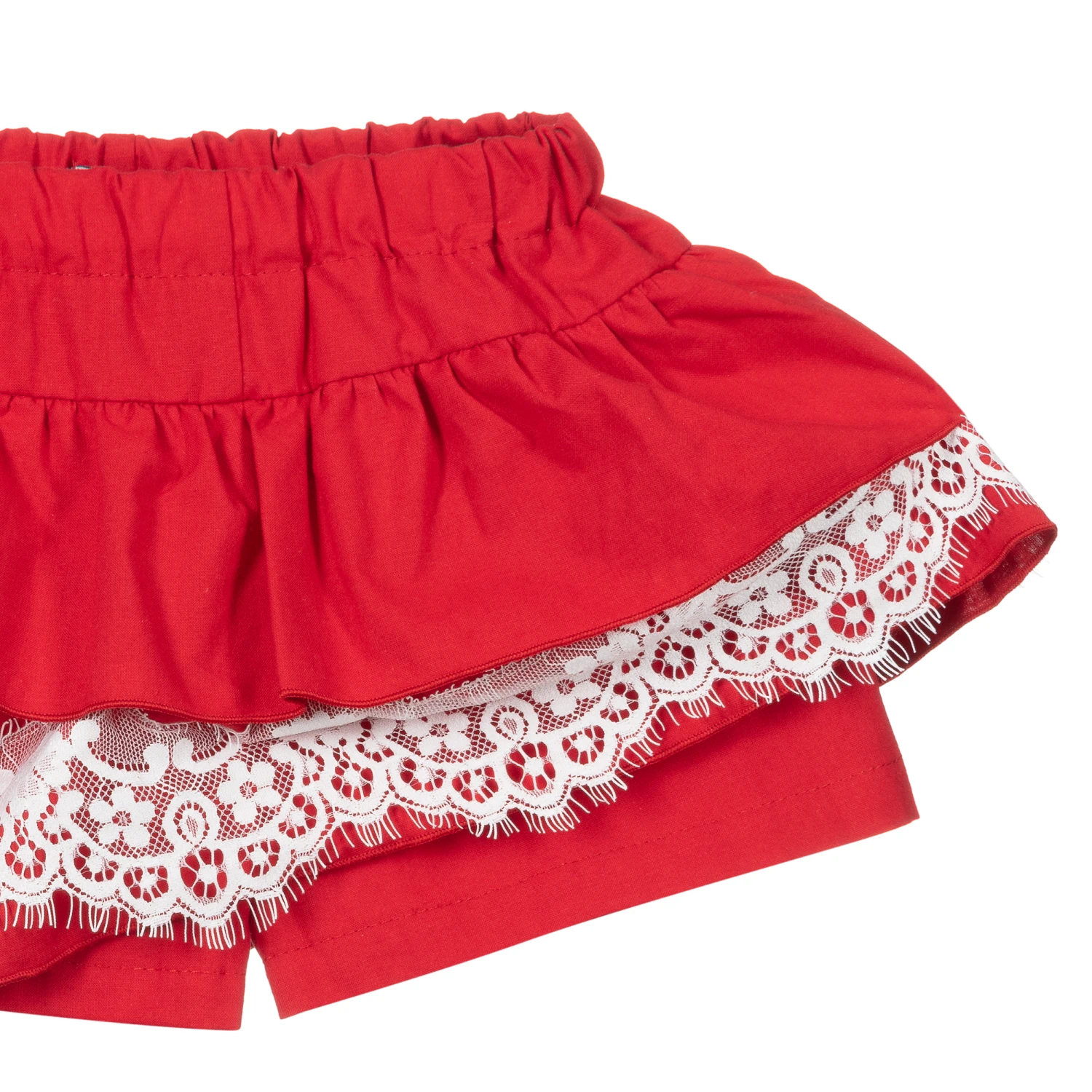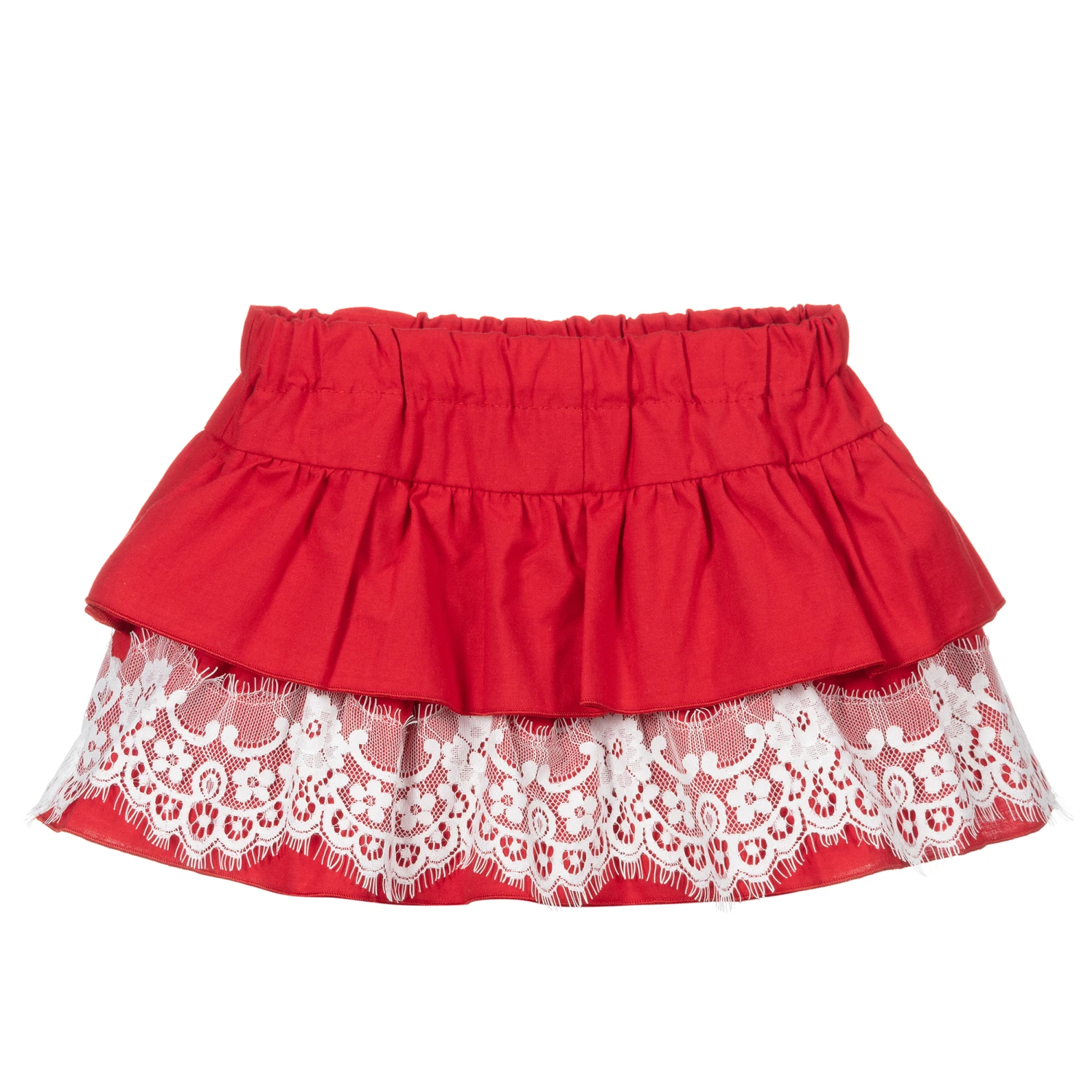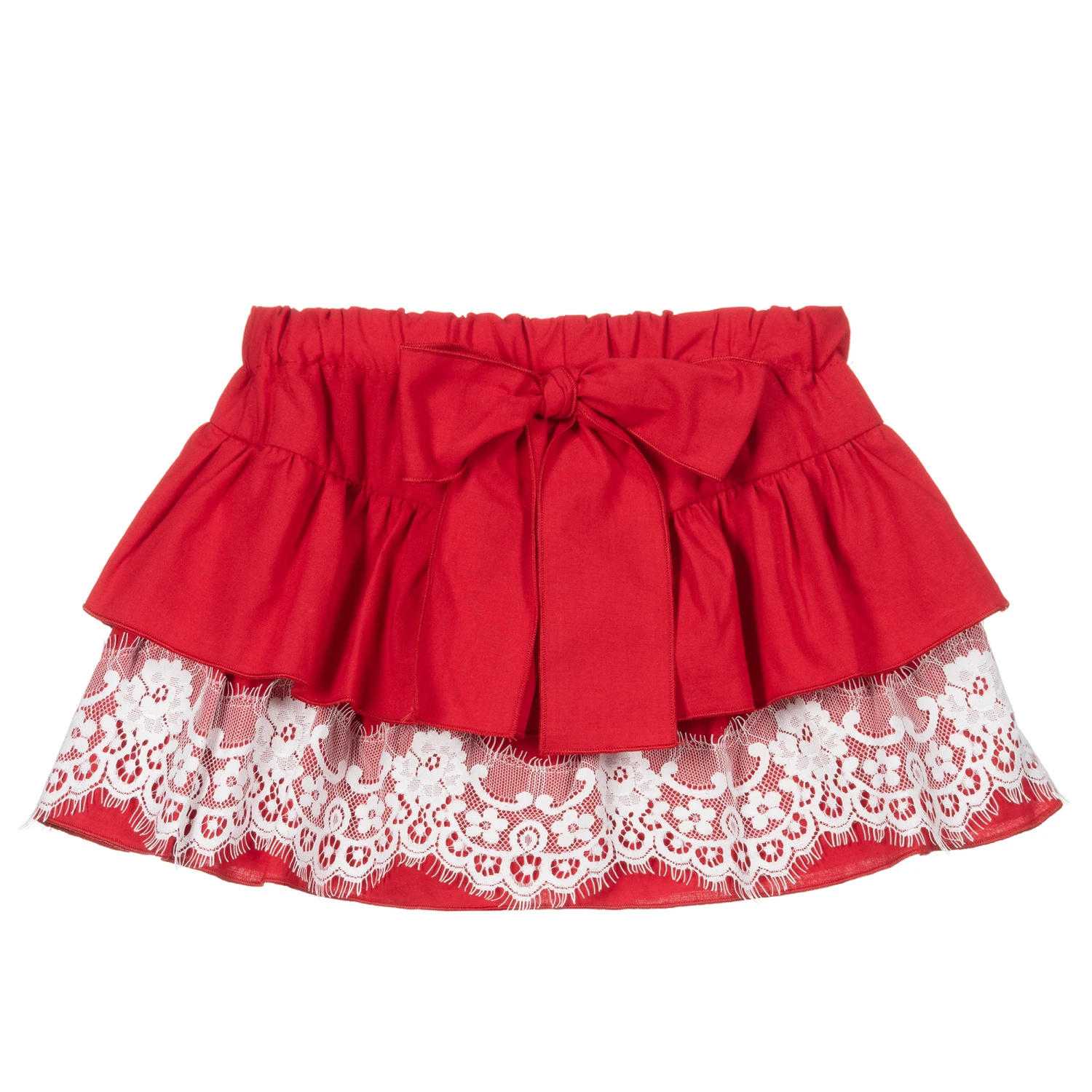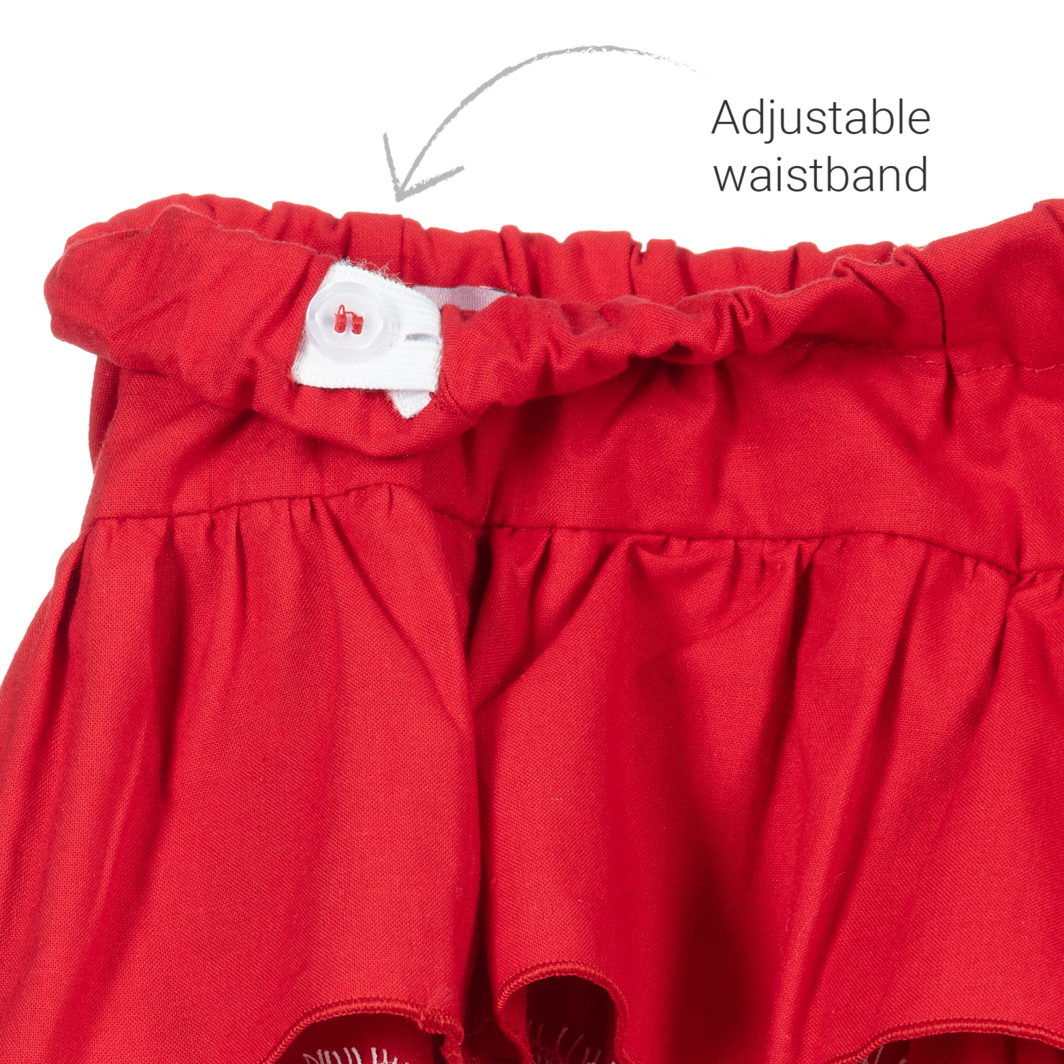 Girls pretty red tiered skort by Phi Clothing, with a beautiful white lace trim and a bow to tie on the back. Made in soft polycotton, it has an adjustable, elasticated waistband.