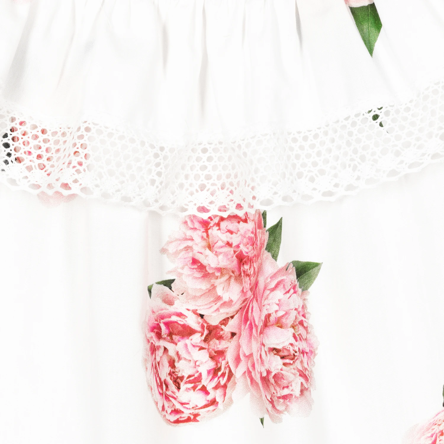 From Phi Clothing, a white blouse for girls with a beautiful pink peony print. Made in lightweight cotton poplin, it has a pretty ruffle around the bodice and flutter sleeves, both with delicate white lace trims.