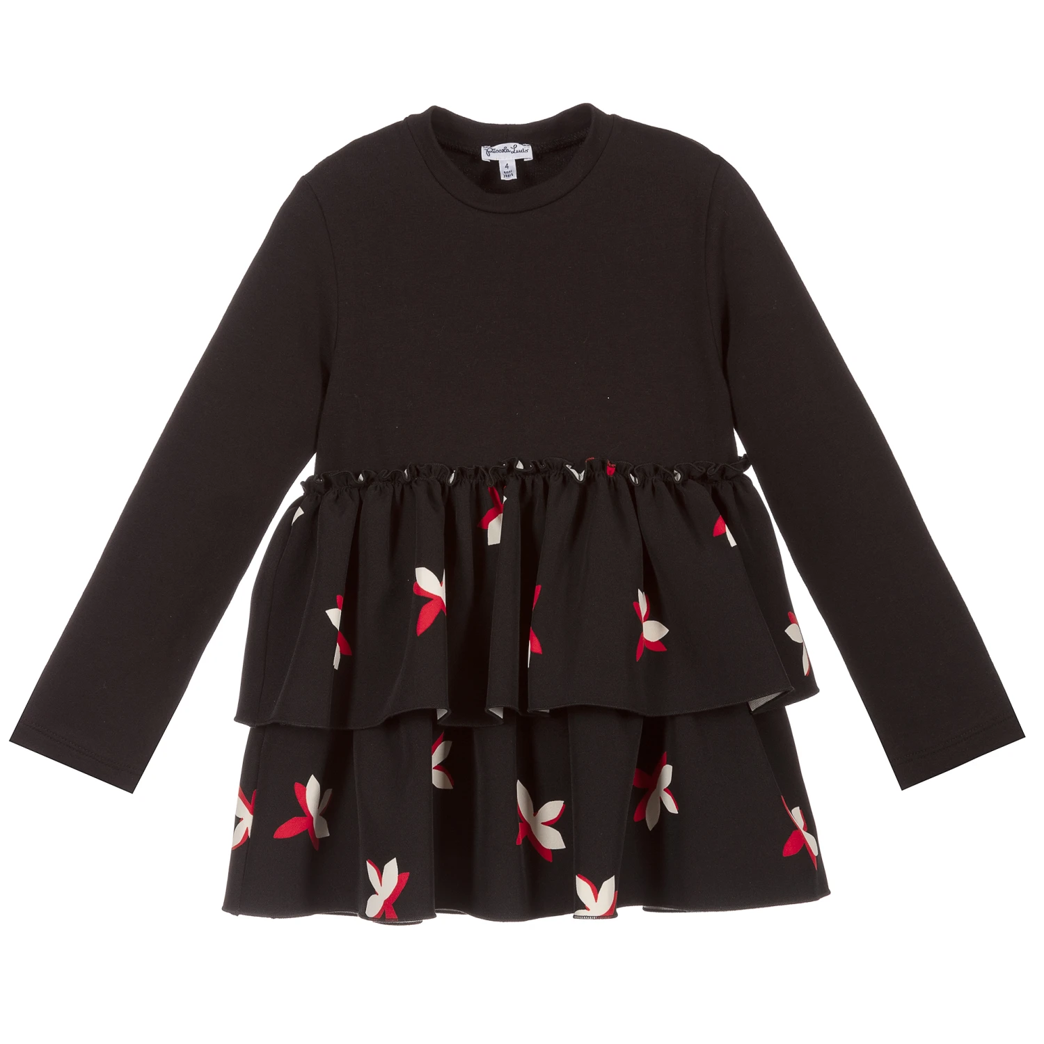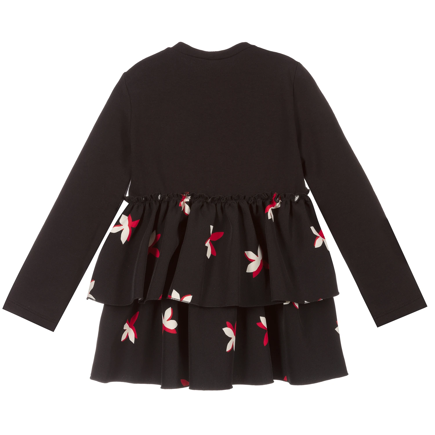 Smart black top for girls by Piccola Ludo. The bodice and sleeves are made in soft cotton jersey and the tiered ruffles have a pretty red and white floral pattern.