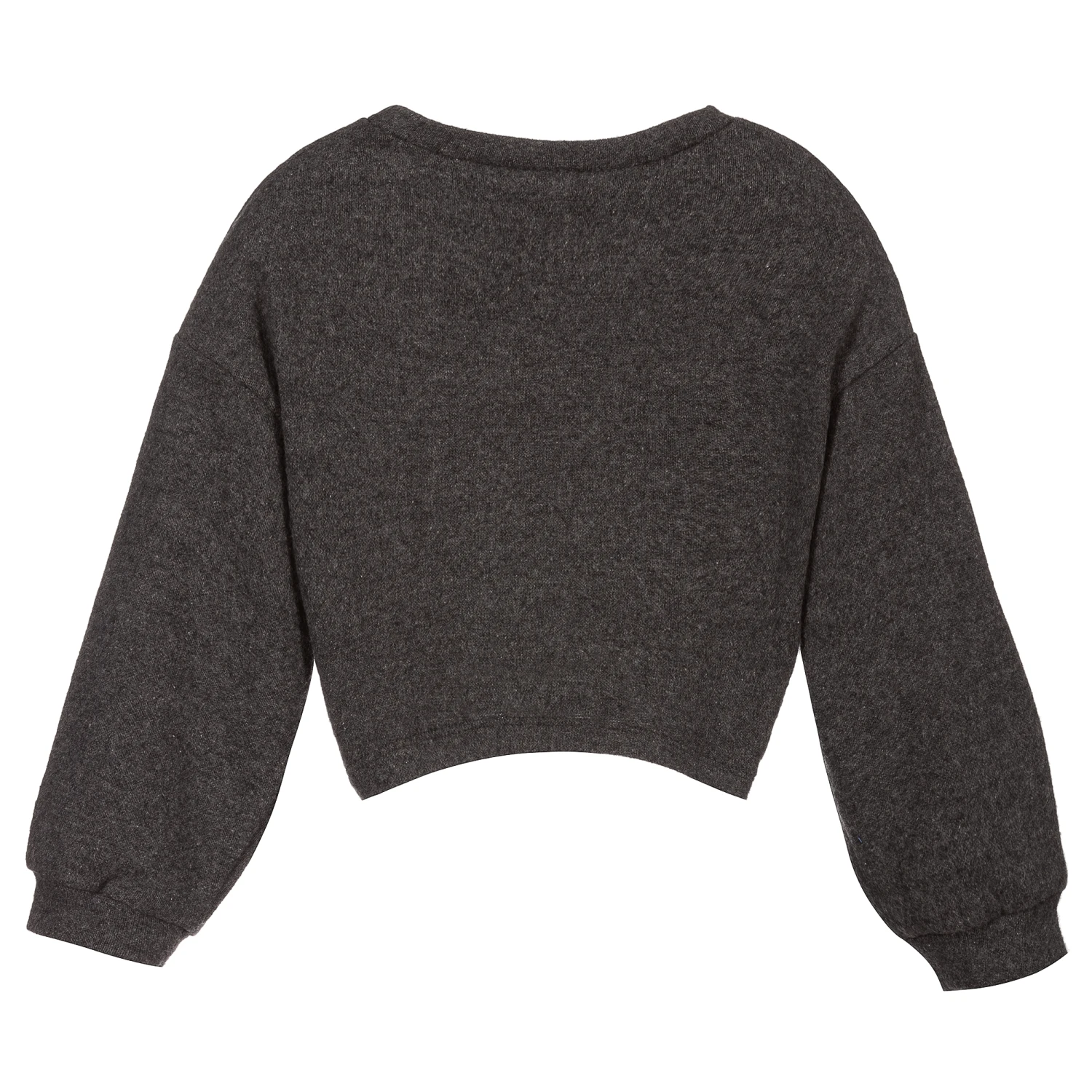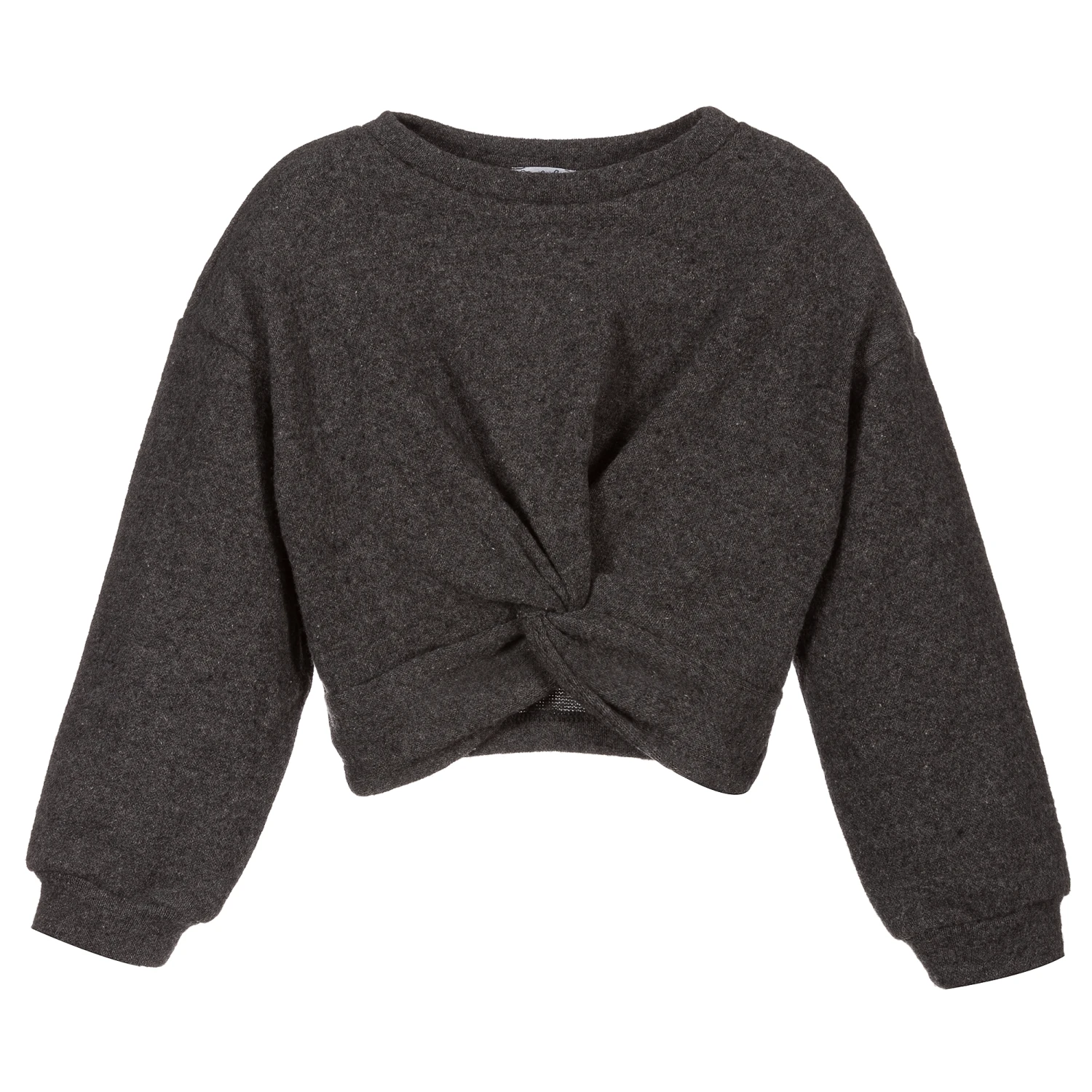 Cropped grey jumper for girls by Piccola Ludo. It is made in a softly knitted cotton blend, with a pretty knot effect at the front.
