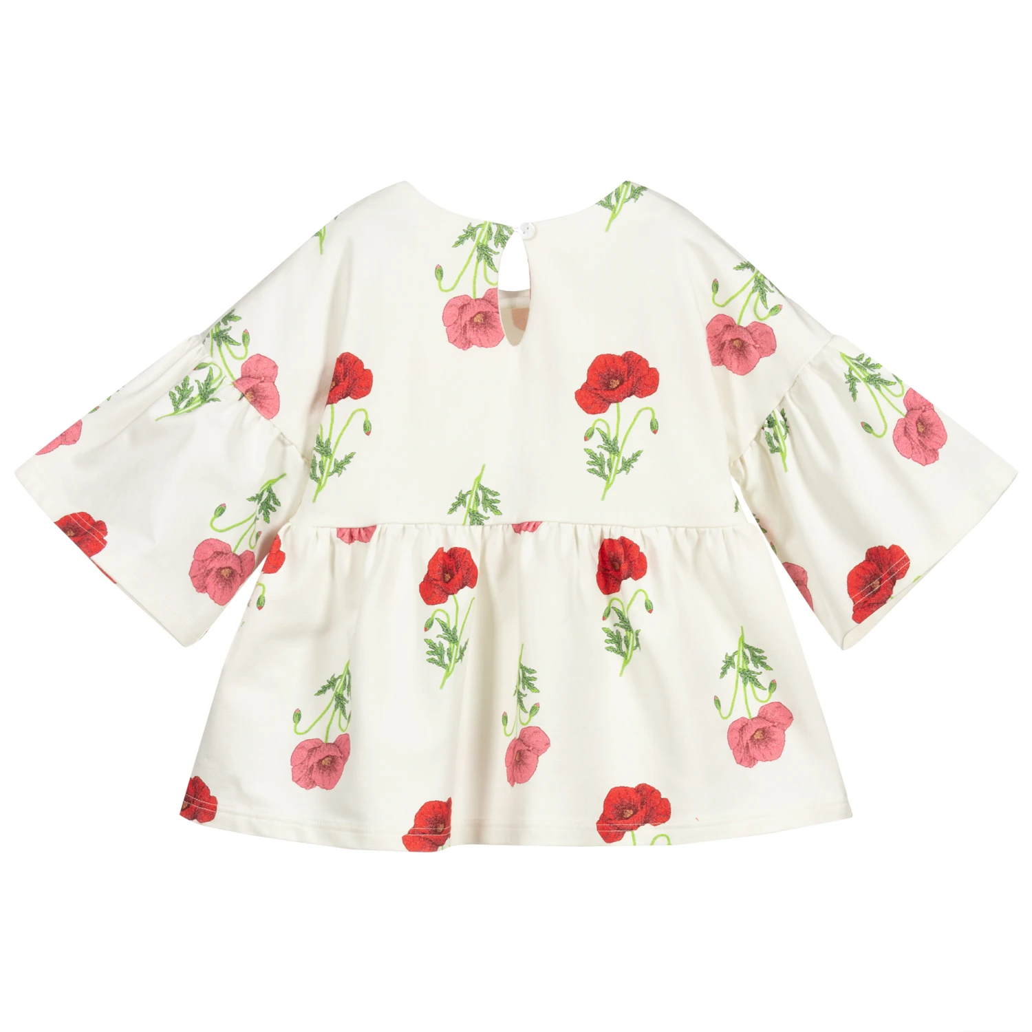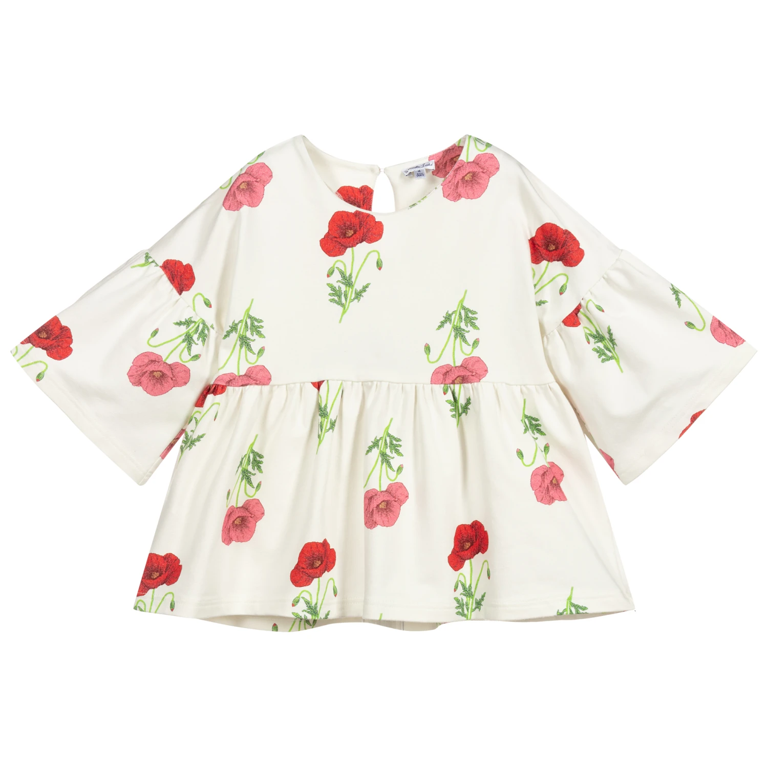 Ivory top by Italian designer Piccola Ludo, with a pretty red and green poppy print. Made in mid-weight cotton jersey, it has gathers below the bodice and around the bell sleeves. The back has a pretty keyhole button fastening and is slightly longer than the front.