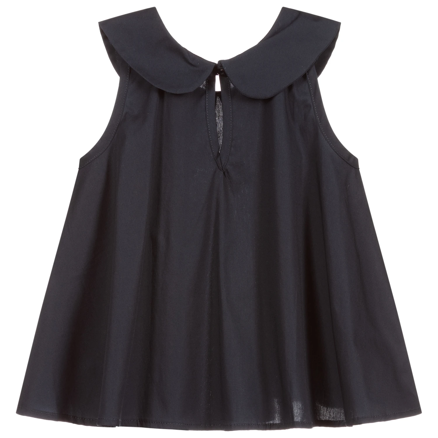 Girls navy blue blouse by Italian designer Piccola Ludo, made in lightweight cotton poplin. It has a wide, flared shape with a rounded collar and a keyhole button fastening on the back.