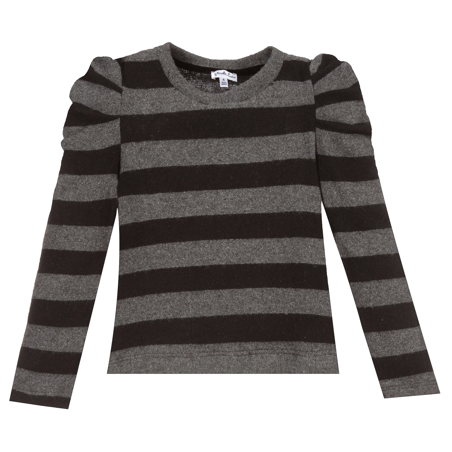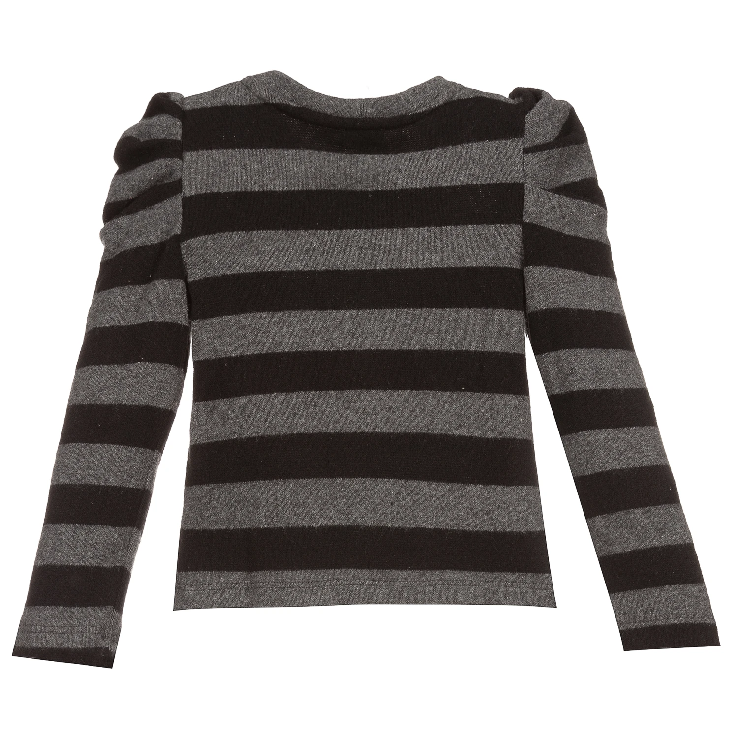 Grey and black striped jumper for girls by Piccola Ludo. Made in a soft cotton blend knit, it has pretty leg-of-mutton sleeves.